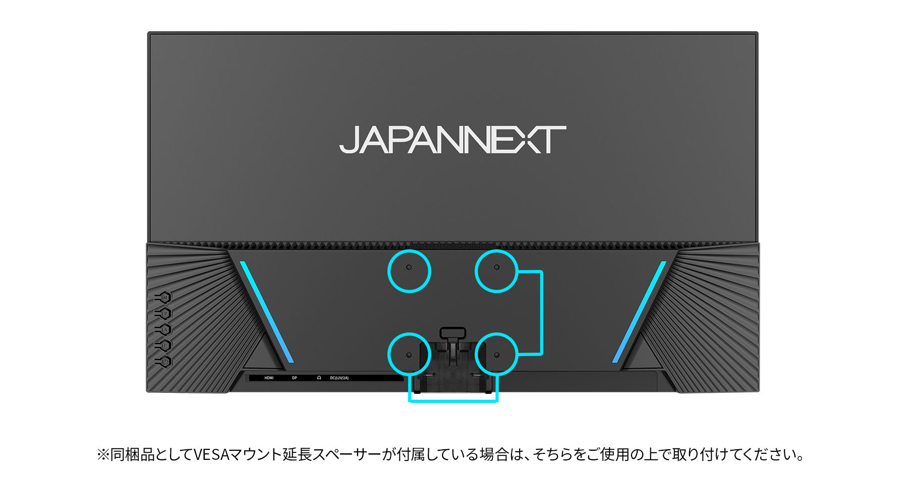 75x75mmのVESAマウントに対応、別売のモニターアームやモニタースタンドなどへの取り付けが可能です。