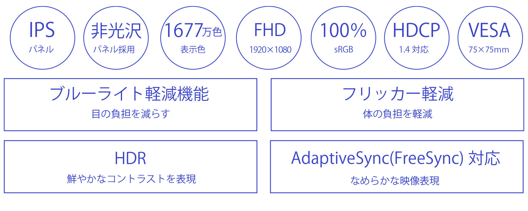 AdaptiveSync(FreeSync)に対応。画面のリフレッシュレートとコンテンツのフレームレートのズレから生じるティアリングを防ぎ、滑らかで美しい映像を実現します。ブルーライト軽減モードを搭載し、フリッカーフリー設計で、目と身体への負担を軽減します。