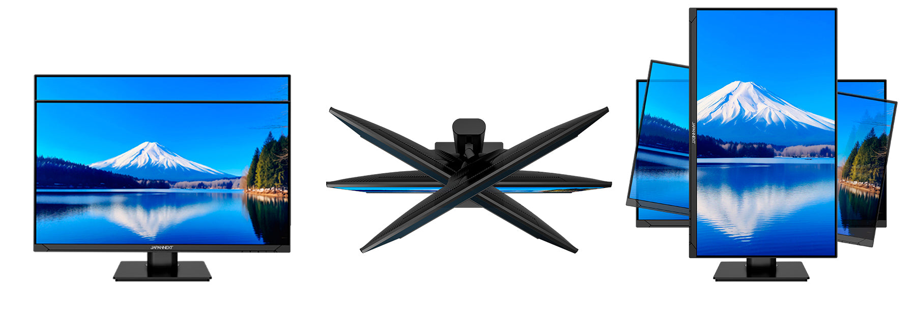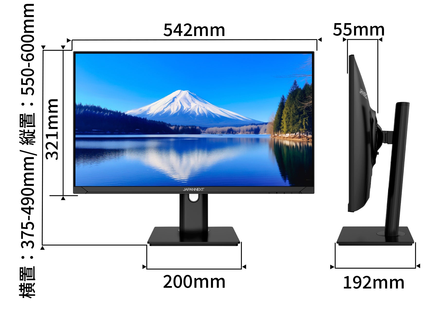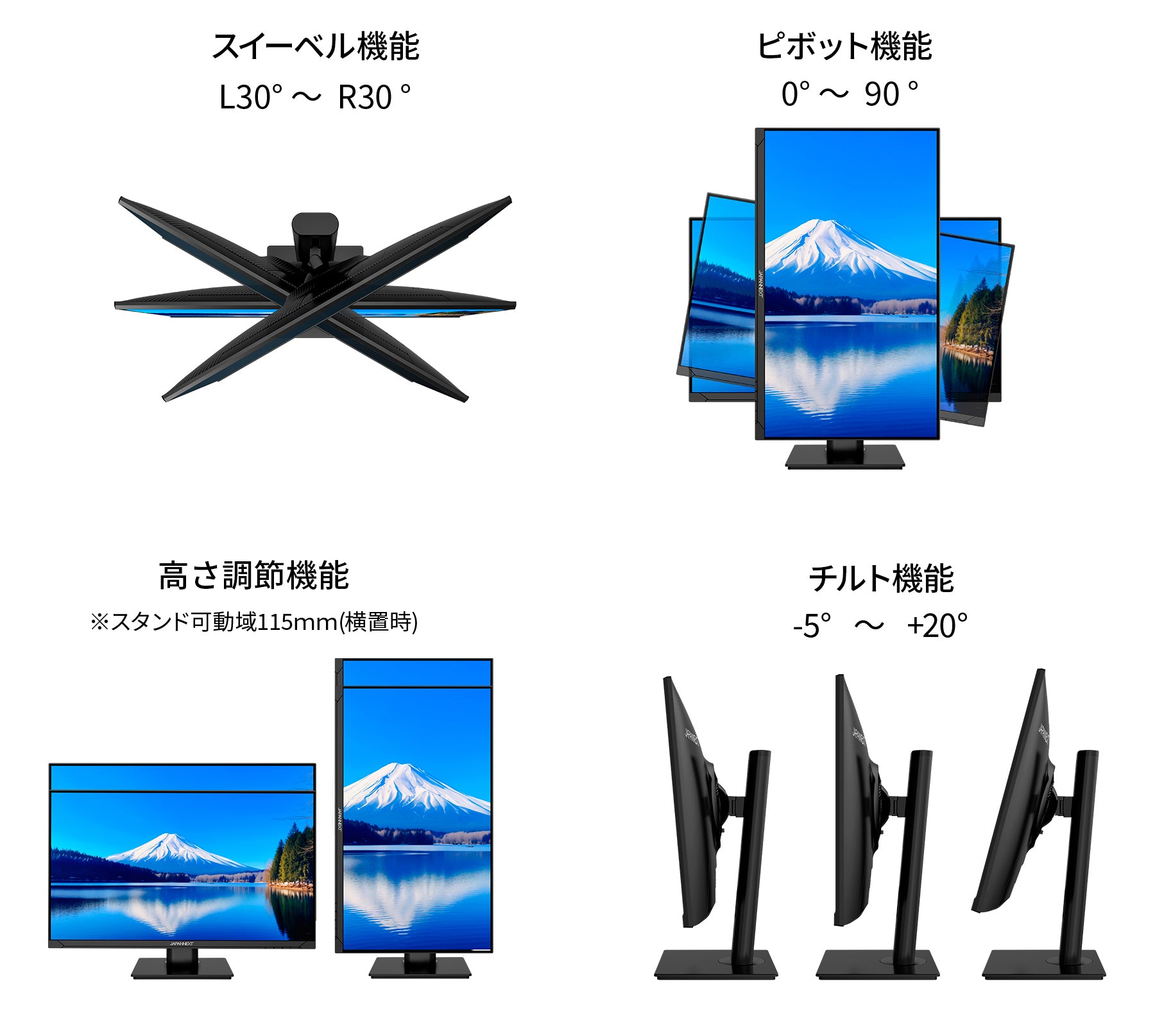 便利な昇降式スタンドを搭載。最大115mm(横置時)の範囲で高さ調整を行うことが可能です。また、90度右に回転させての縦での使用も可能です。