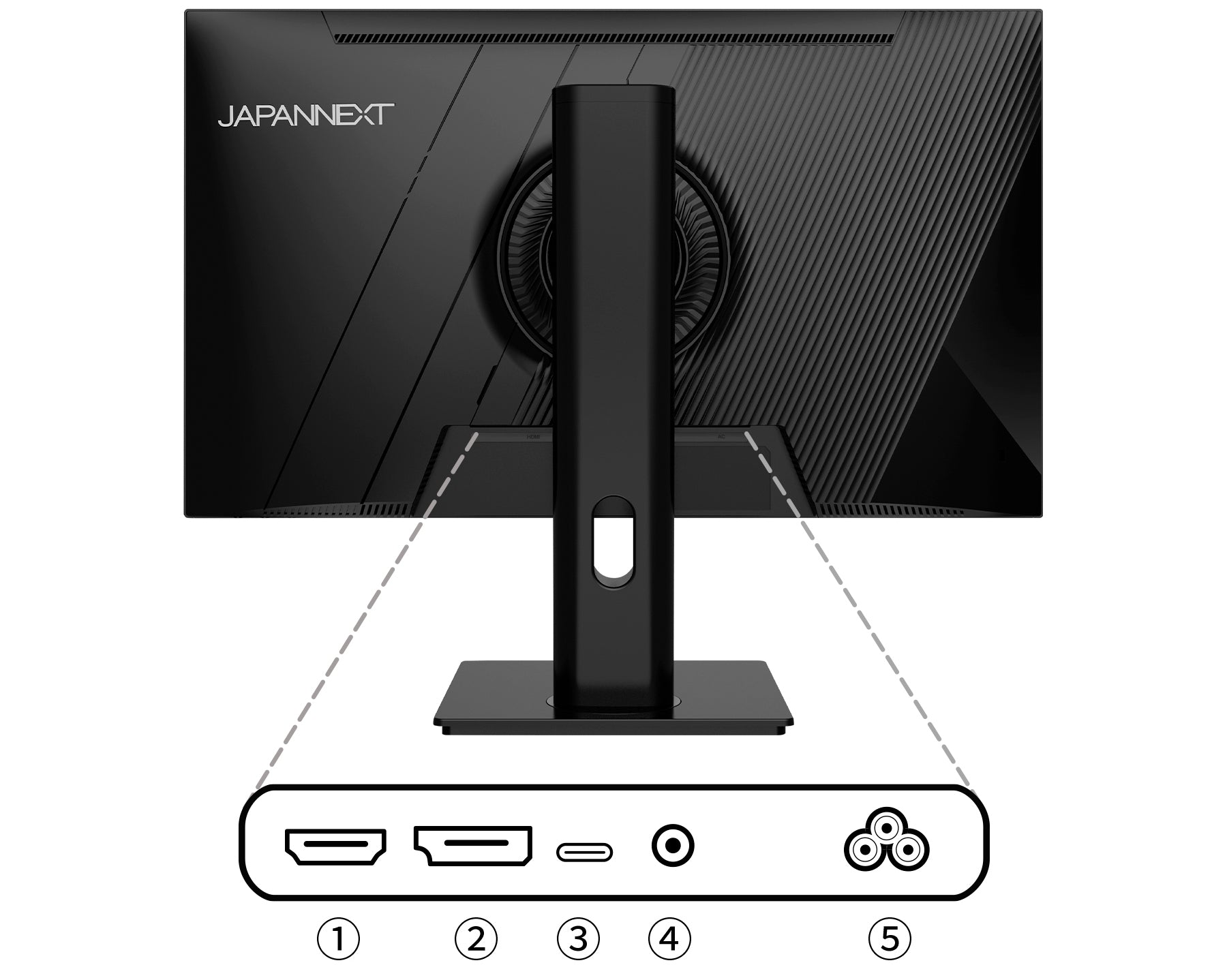 インターフェイスはHDMI1.4端子x1,Display Port1.2端子x1とUSB Type-C(最大65W給電)端子x1を搭載しています。USB-C(最大65W給電)は、対応のPCであればUSB-Cケーブル1本でモニターへの映像出力とノートPCへの給電が可能。ケーブル1本でスッキリ接続出来るだけでなく、テレワーク、出社併用の場合などノートPCのACアダプターを持ち運ぶ必要が無くなります。