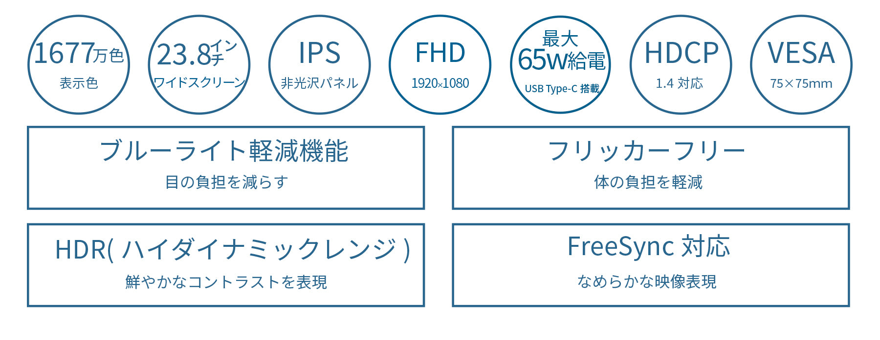 23.8インチの画面は省スペースながら大画面のセカンドモニターになり、テレワークにも最適です。長時間使用時に眼に優しいフリッカーフリー(ちらつき軽減)、ブルーライト軽減モードを搭載します。