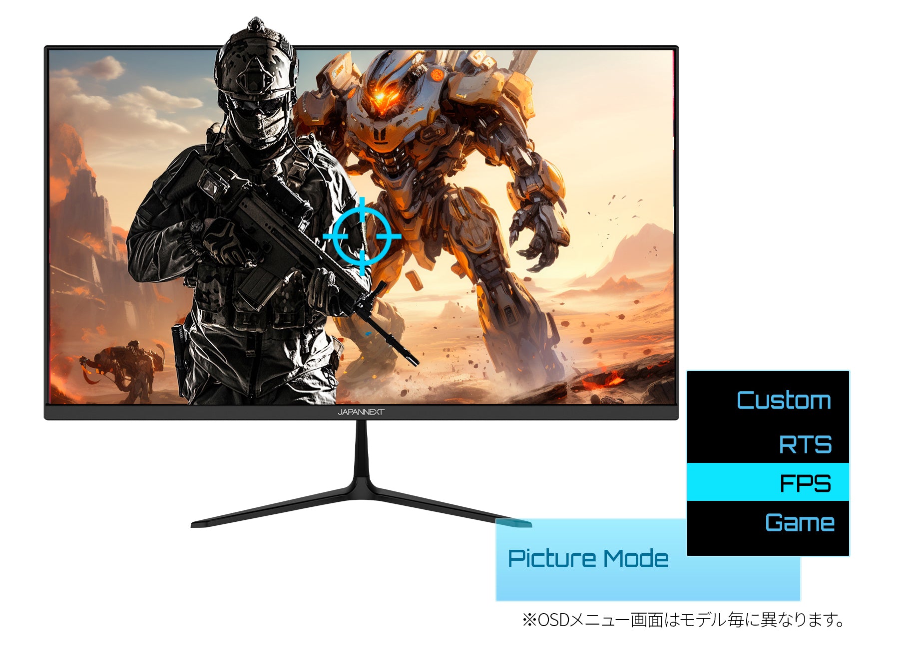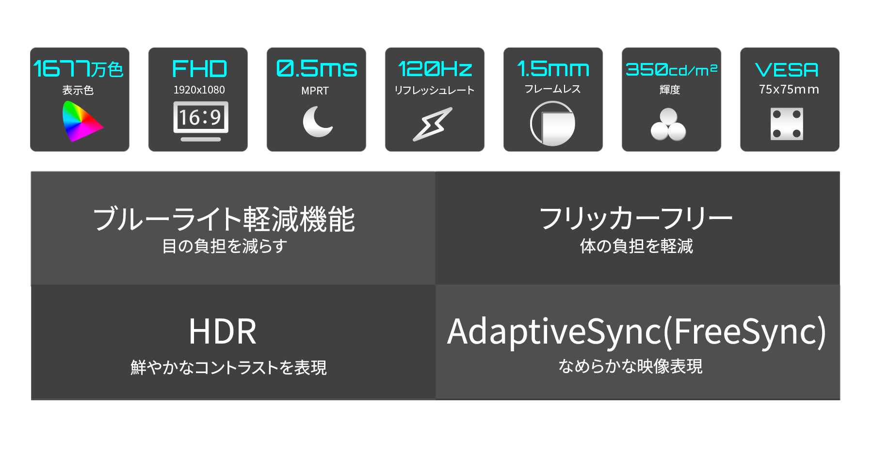 120Hzの高速リフレッシュレートと0.5ms(MPRT)の応答速度により、高精細で滑らかな映像表現を実現し、FPSなどの動きの速いゲームでも快適なプレイが可能です。※MPRT 0.5msはリフレッシュレート100Hz以上で有効。