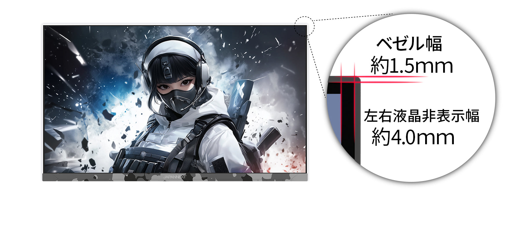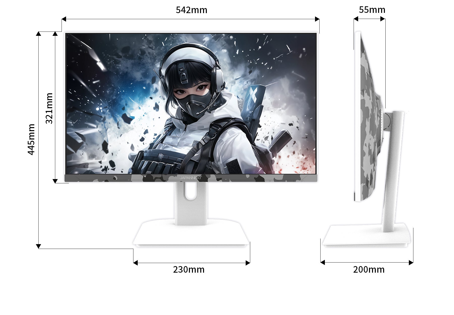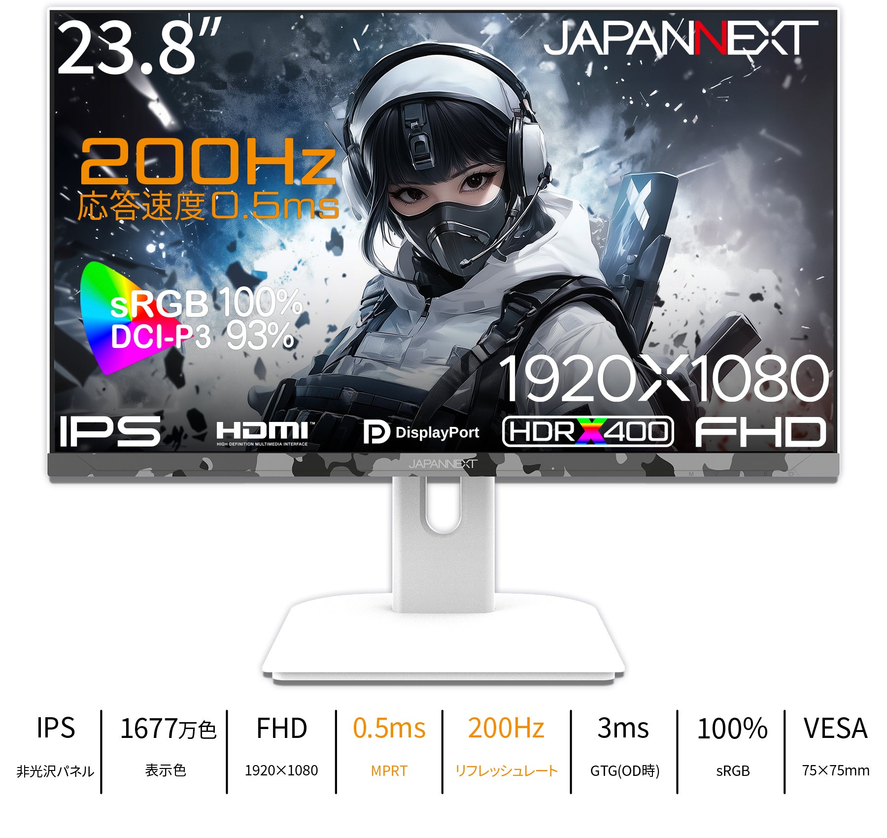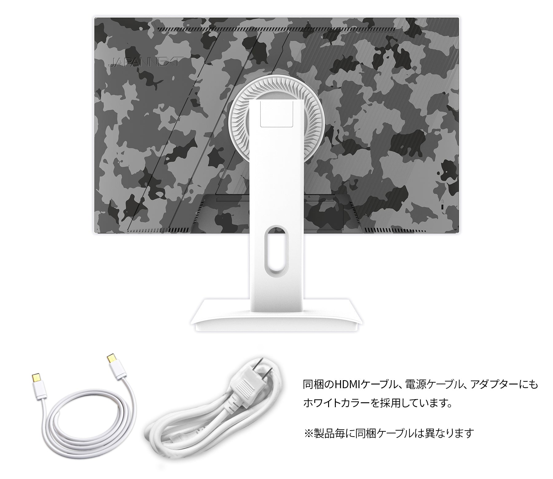 23.8インチのIPSパネルを搭載し、0.5ms(MPRT)の高速応答速度と200Hzの高速リフレッシュレートに対応した、フルHD(1920x1080)解像度のゲーミングモニターです。本体カラーにカモフラージュホワイト(迷彩柄)を採用。美しい視覚効果と個性的なデザインを融合し、個性が光る特別なモニターとなります。迷彩でゲームの世界への没入感を上げ、デスクトップにスタイリッシュなアクセントを提供します。「JN-IPS238G200F-Camo-W」は、付属のケーブル類全てにホワイトカラーを採用します。