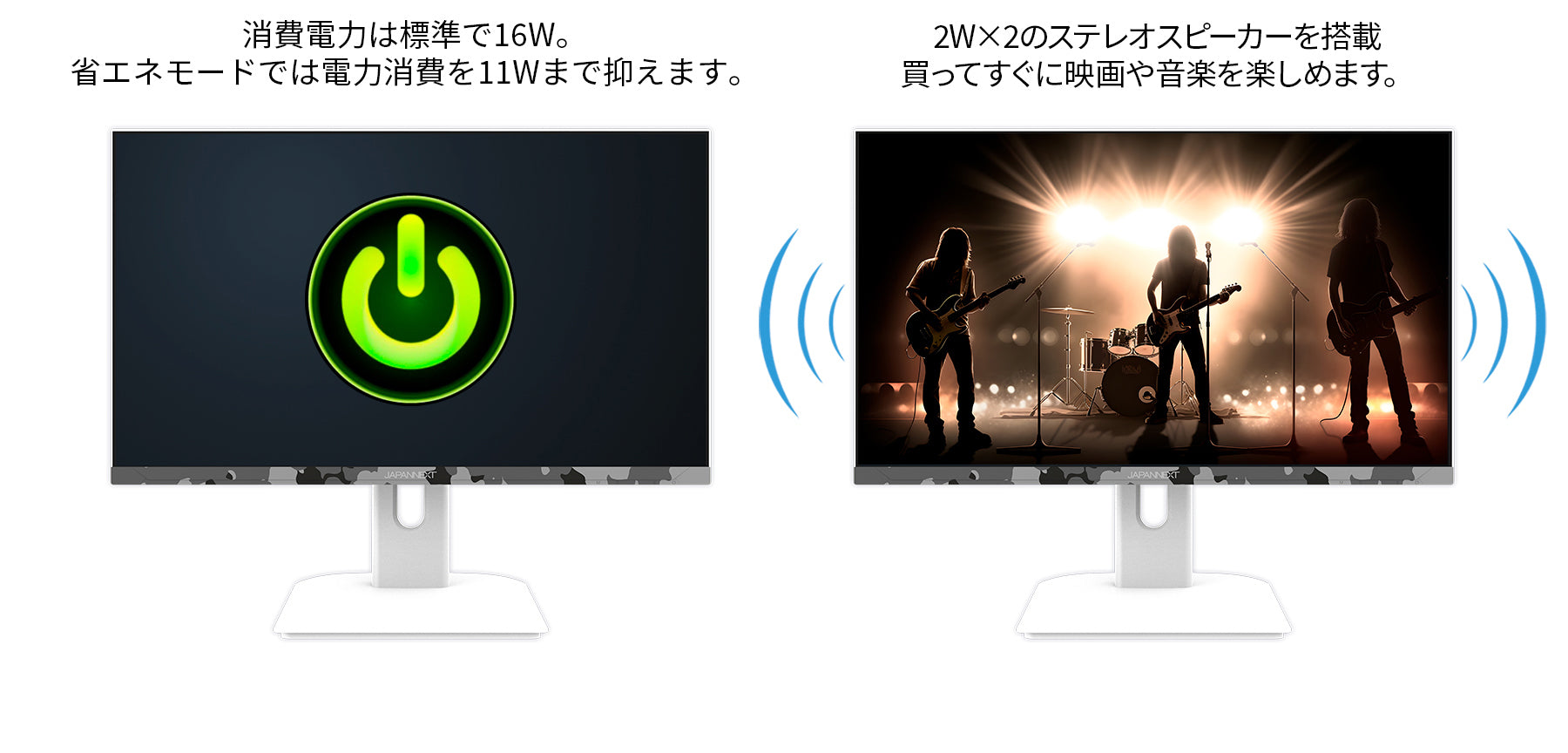 75x75mmのVESAマウントに対応、別売のモニターアームやモニタースタンドなどへの取り付けが可能です。2Wx2のスピーカーを搭載します。
