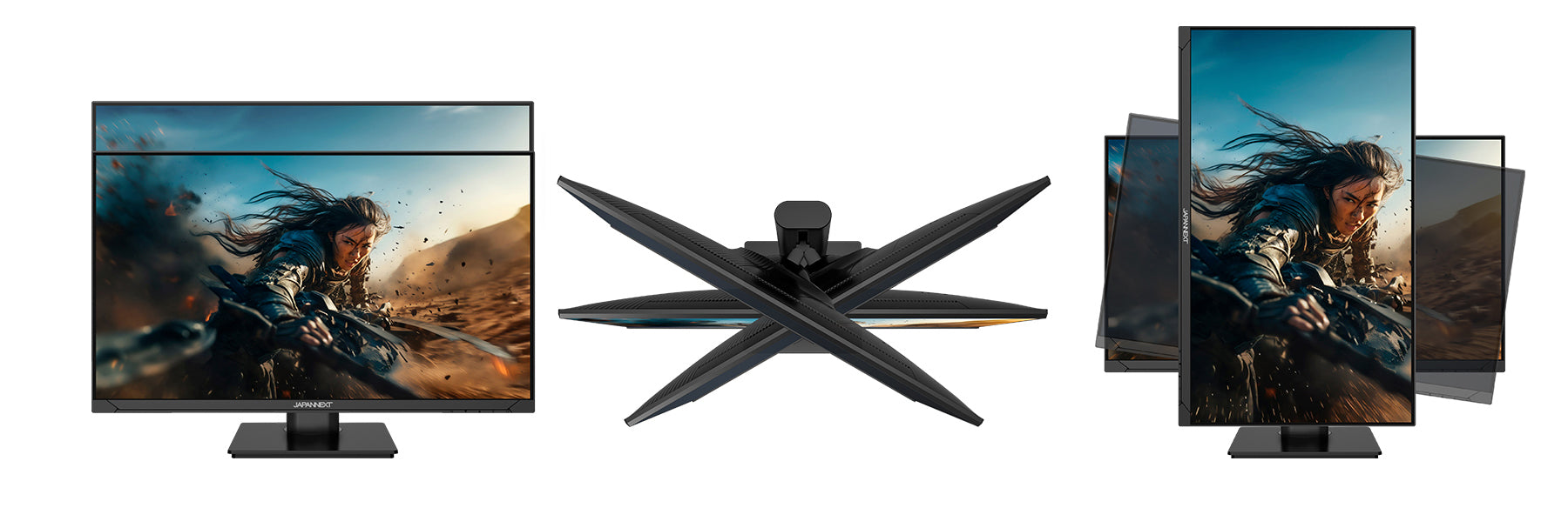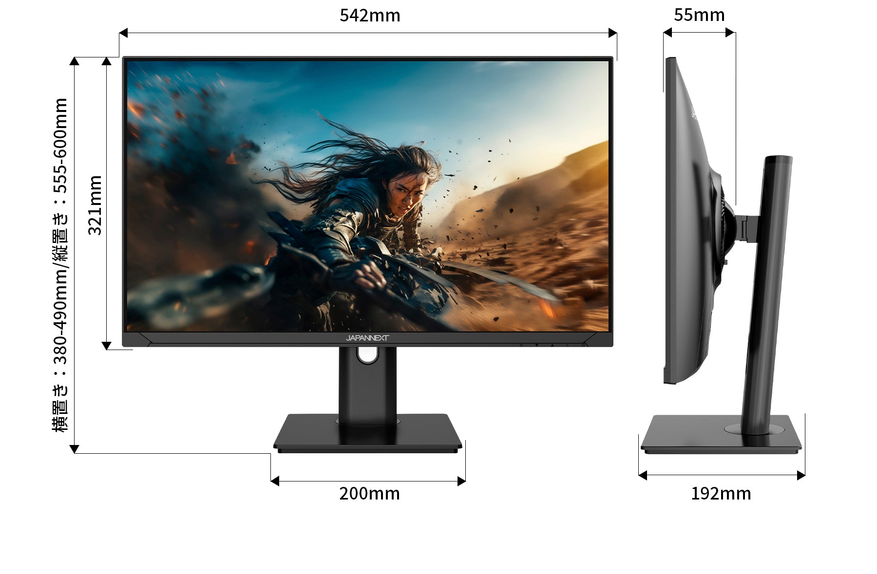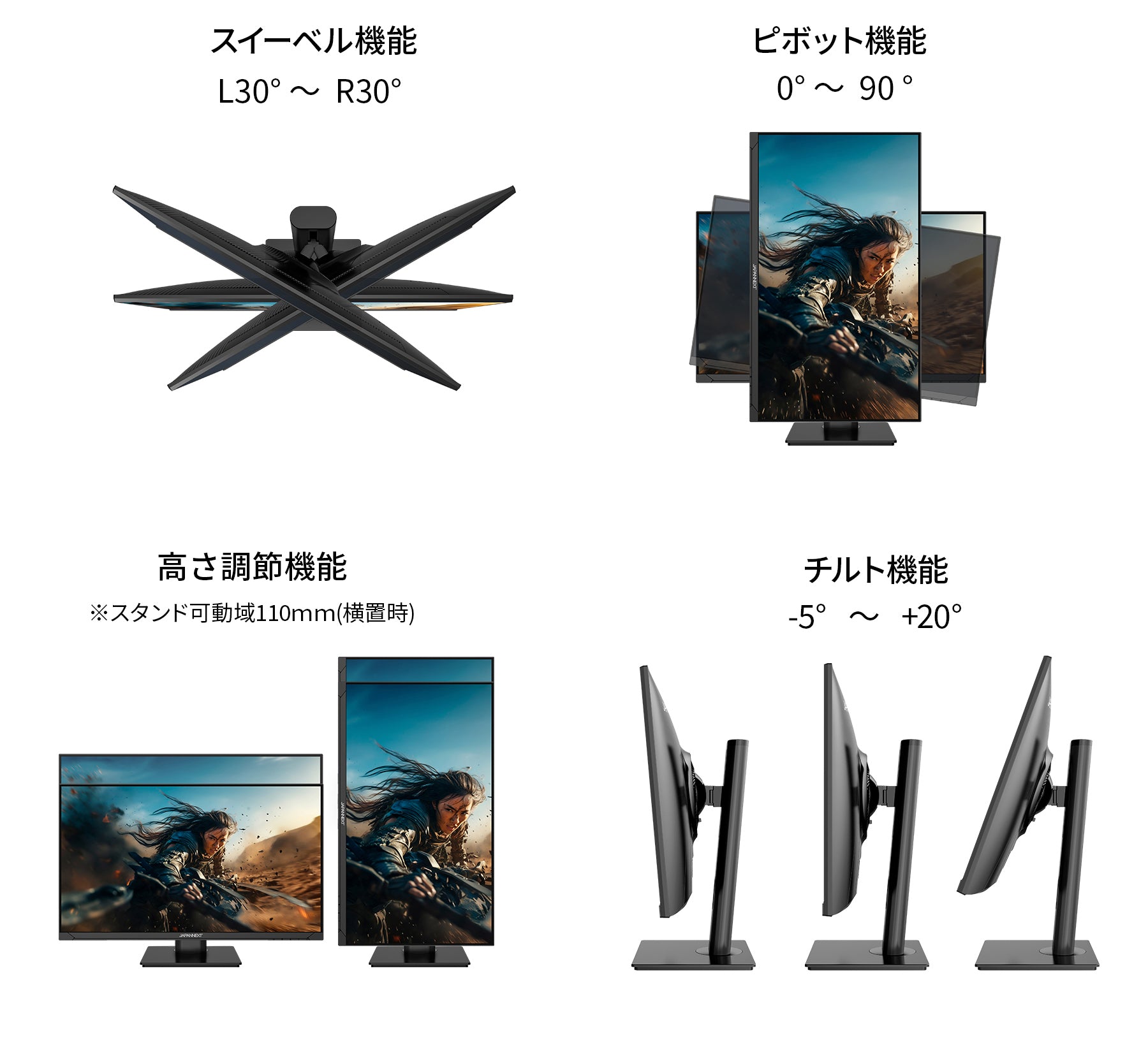 便利な昇降式多機能スタンドを採用、110mmの範囲(横置時)で高さ調節が可能です。また縦画面として使用出来るピボット(回転)機能にも対応します。