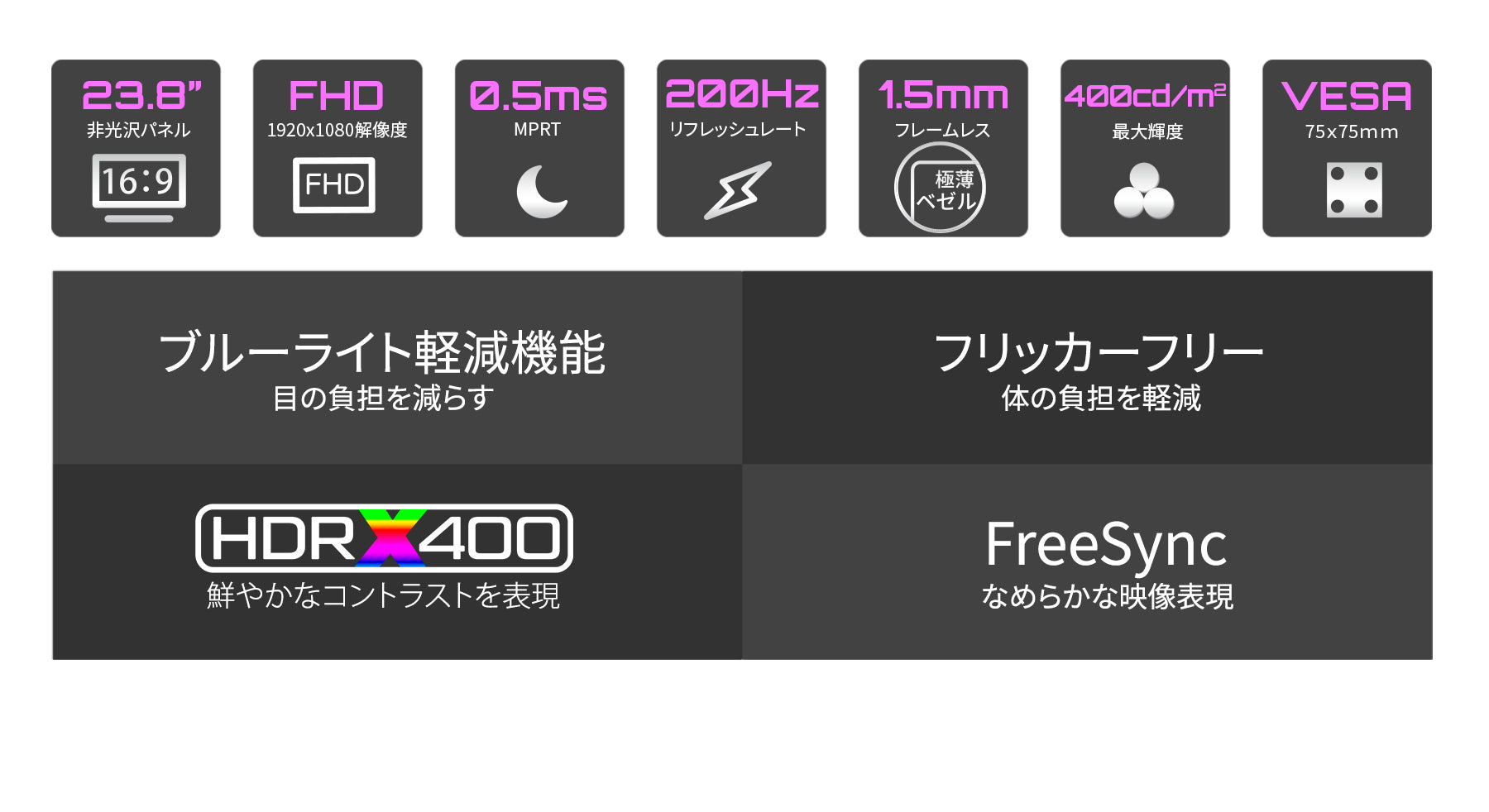 23.8インチのIPSパネルを搭載し、0.5ms(MPRT)の高速応答速度と200Hzの高速リフレッシュレートに対応した、フルHD(1920x1080)解像度のゲーミングモニターです。