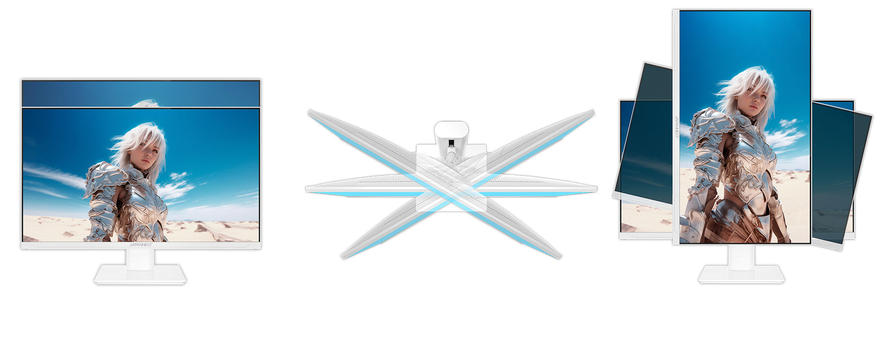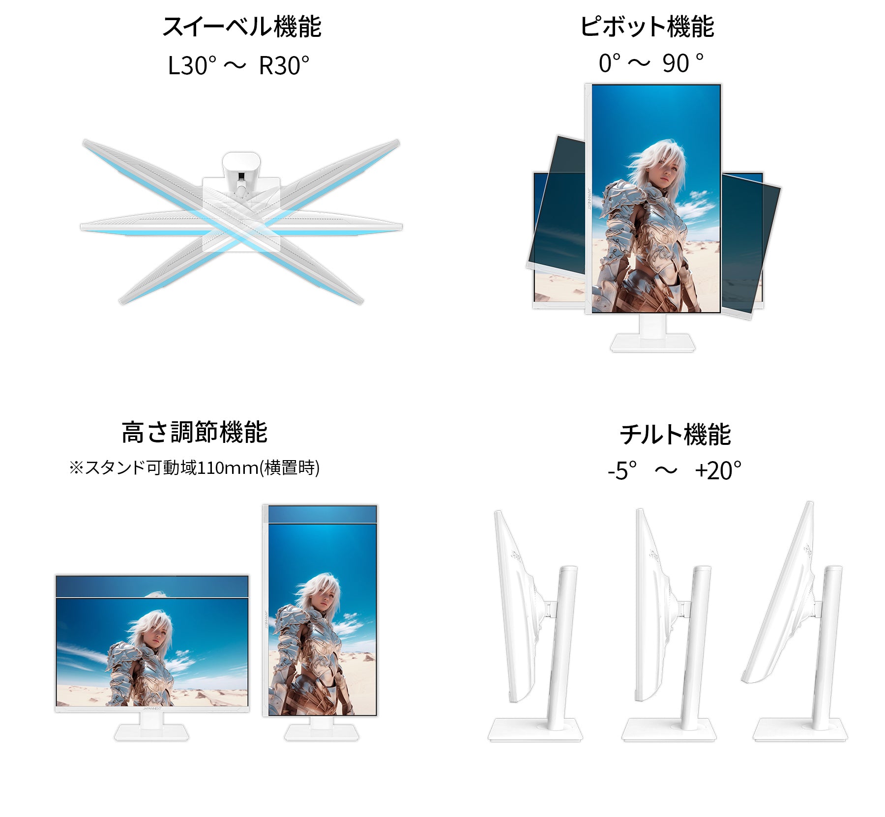 昇降式スタンドを採用、110mmの範囲(横置時)で高さ調節が可能です。また縦画面として使用出来るピボット(回転)機能にも対応します。