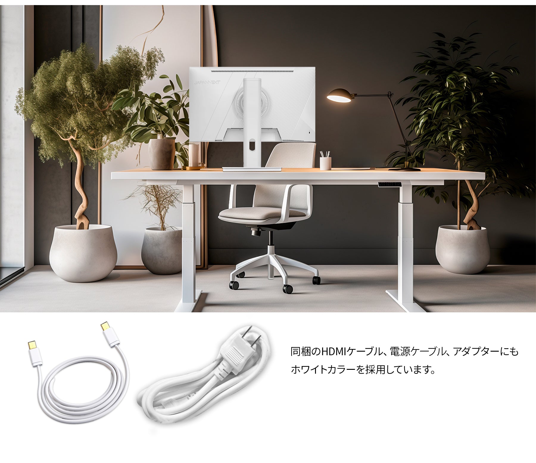 本体カラーにホワイトを採用。モニターベゼルやスタンドも白となっており、爽やかでおしゃれな空間を演出したい場合や、医療機関などでの使用にも最適なデザインです。さらに、付属のケーブルと電源アダプターにもホワイトカラーを採用。全体が白基調に統一された部屋や医療機関などでの使用にも最適です。