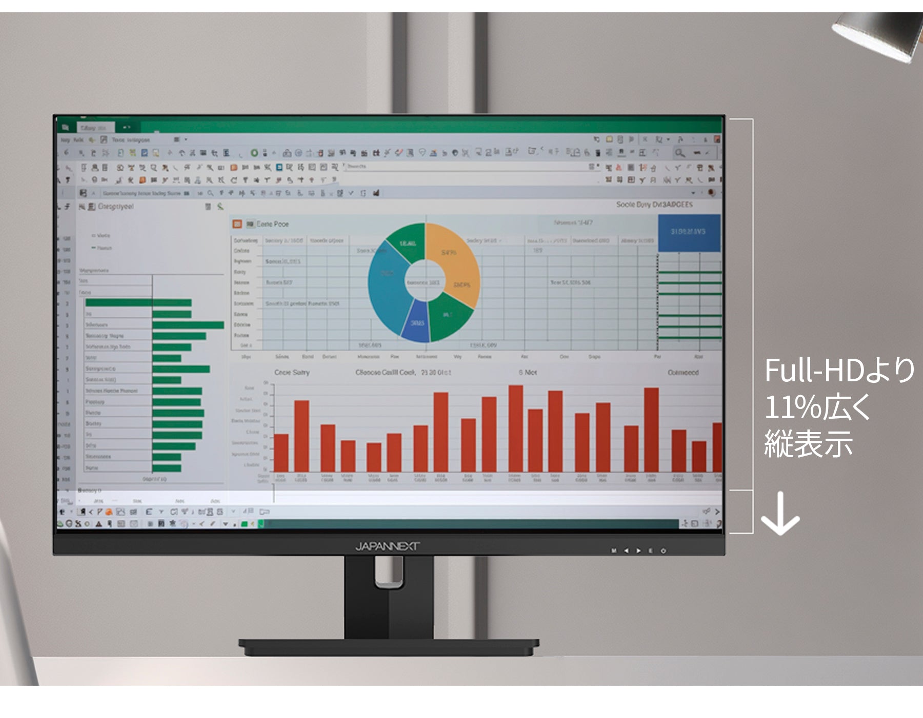 Full HDの解像度1920×1080アスペクト比16:9よりも縦表示部分が11%広くなるので作業効率が上がります。
