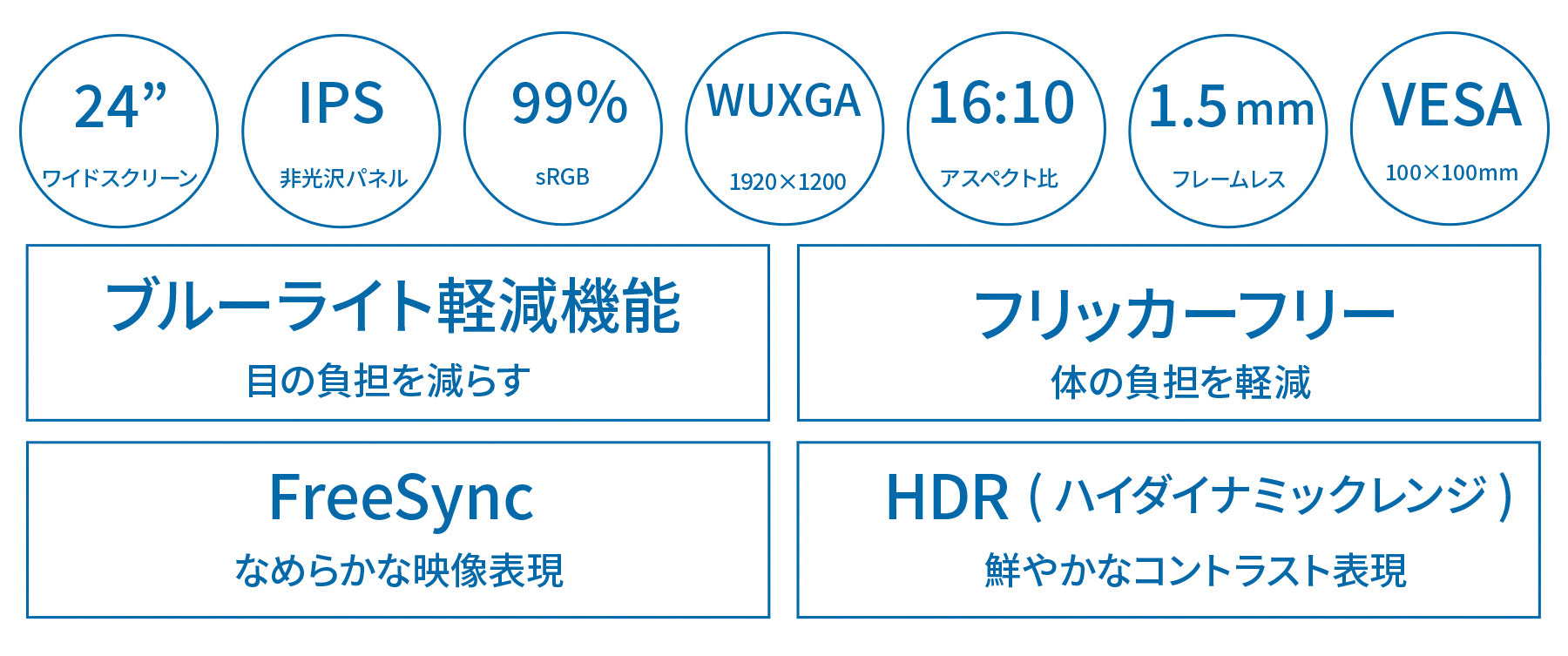 24インチのIPSパネルを採用し、WUXGA(1920x1200)解像度、HDRに対応した液晶モニターです。300cd/m2の高輝度、広視野角のIPSパネルを採用し画像をくっきりと鮮やかに映し出します。sRGB99%の広色域に対応、動画や写真編集などにも最適です。