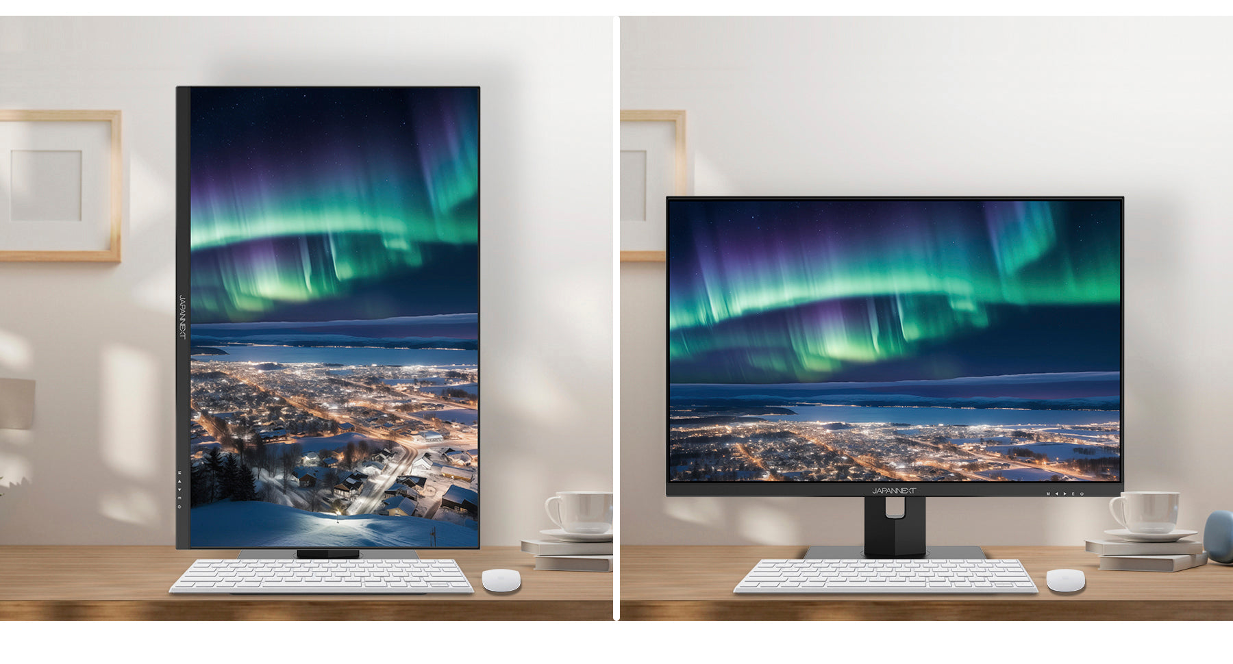 高さ調整が可能な昇降式スタンドを搭載、150mmの範囲内で最適な高さに画面を調整可能です。また縦画面として使用出来るピボット(回転)機能にも対応します。