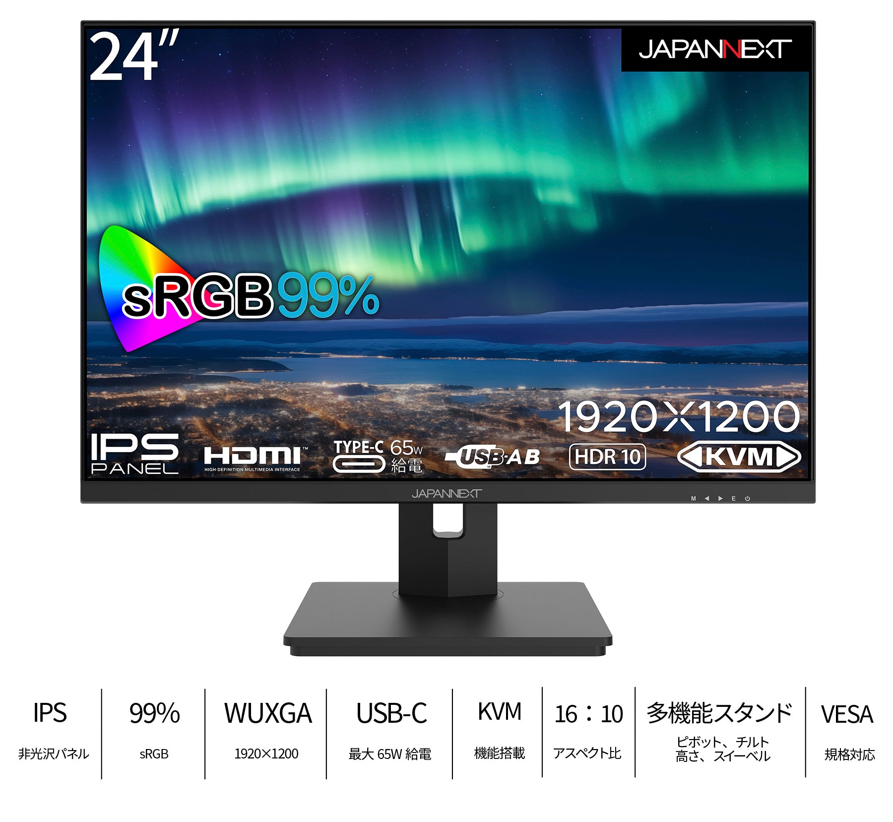 24インチのIPSパネルを採用し、WUXGA(1920x1200)解像度、HDRに対応した液晶モニターです。300cd/m2の高輝度、広視野角のIPSパネルを採用し画像をくっきりと鮮やかに映し出します。sRGB99%の広色域に対応、動画や写真編集などにも最適です。