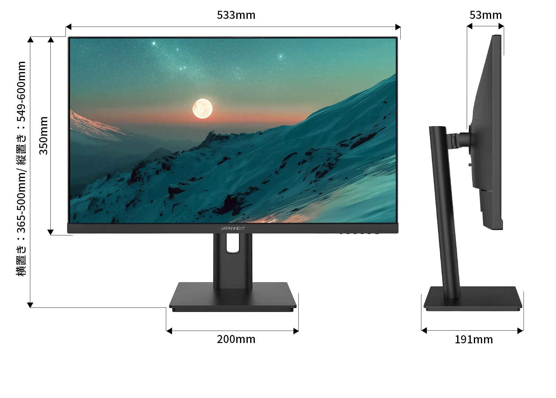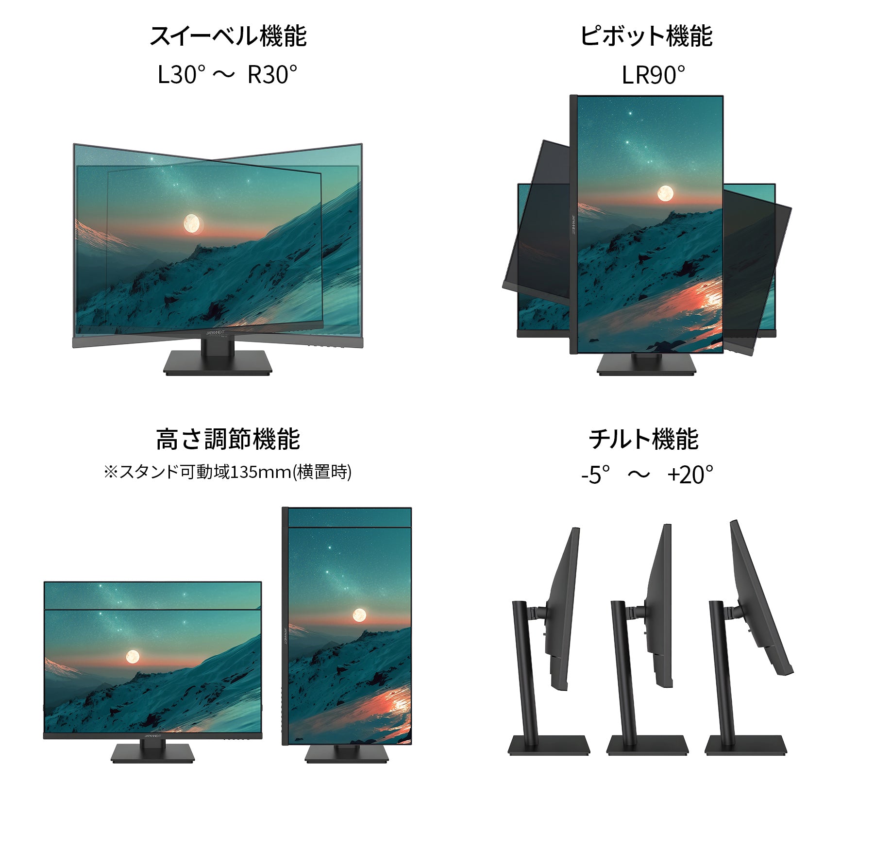 高さ調整が可能な昇降式多機能スタンドを搭載、最大135mmの範囲(横置時)で最適な高さに画面を調整可能です。また、縦画面として使用出来るピボット(回転)機能にも対応します。スイーベル(首振り)機能は、左右各30°の範囲で動かせます。