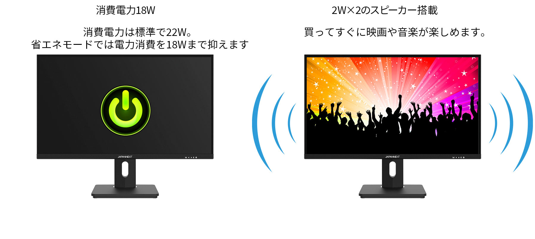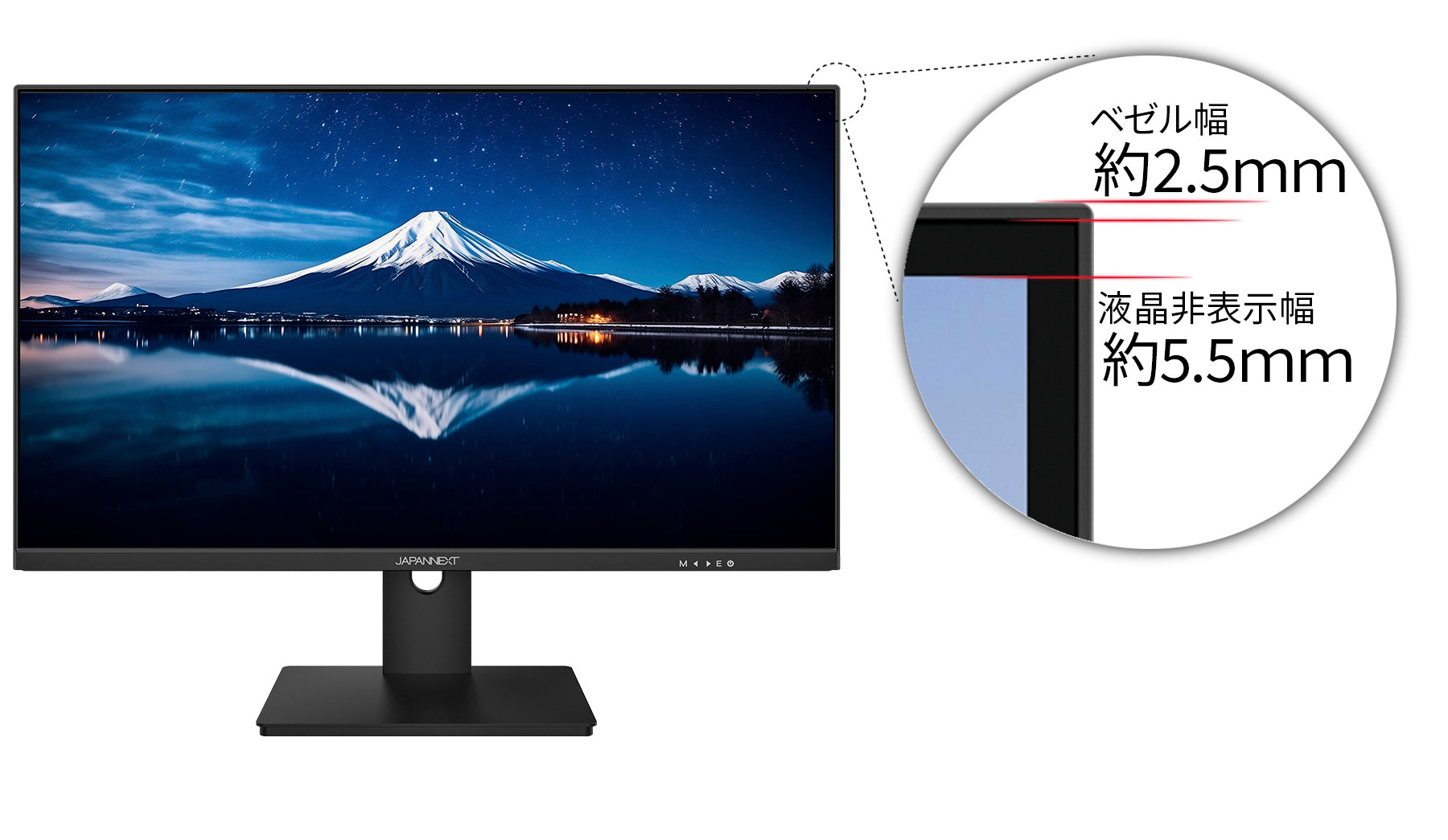スタイリッシュなフレームレスデザインを採用しマルチモニターにも最適です。100x100mmのVESAマウントに対応しますので、別売りのモニターアームなどに使用が可能です。