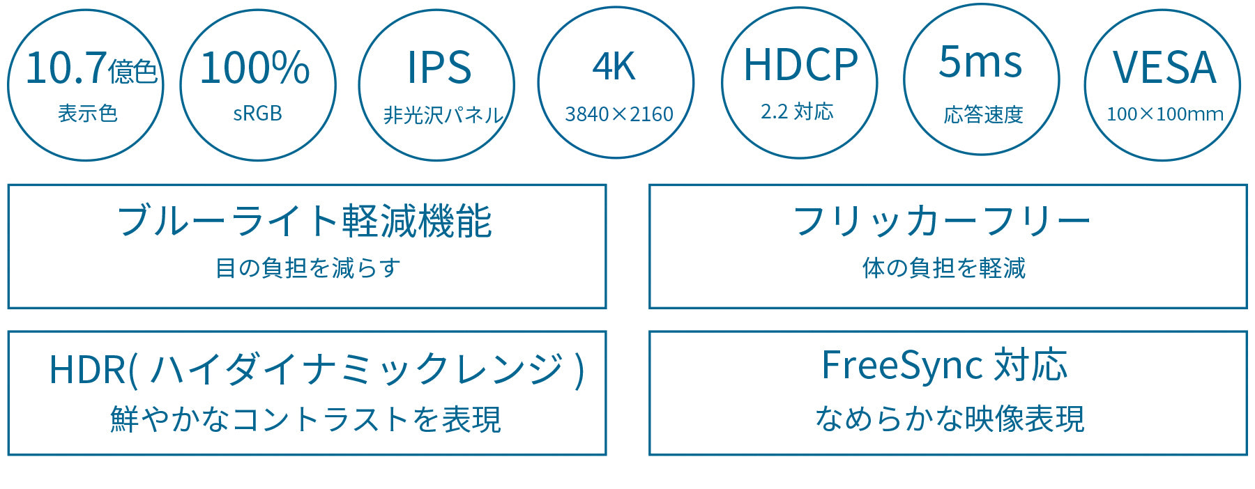 sRGB 100%の色域に対応し映像を美しく鮮やかに表示します。インターフェイスはHDMI 2.0端子を1つとHDMI 1.4端子を2つ、さらにDisplayPort 1.2端子を1つ搭載しています。長時間使用時に眼に優しいフリッカーフリー(ちらつき軽減)、ブルーライト軽減モードを搭載します。