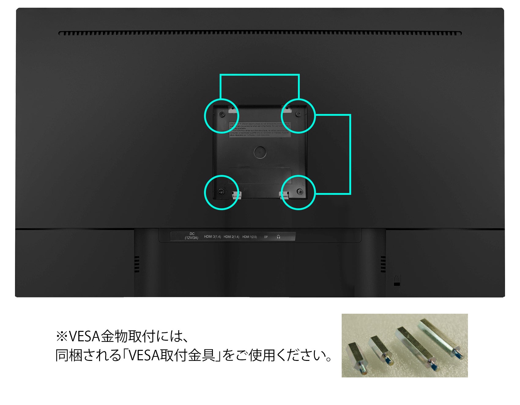 同梱されるVESA取付金具を使用して、付属スタンドを取り外すことにより、アームや壁掛け金具を取り付けることができます。