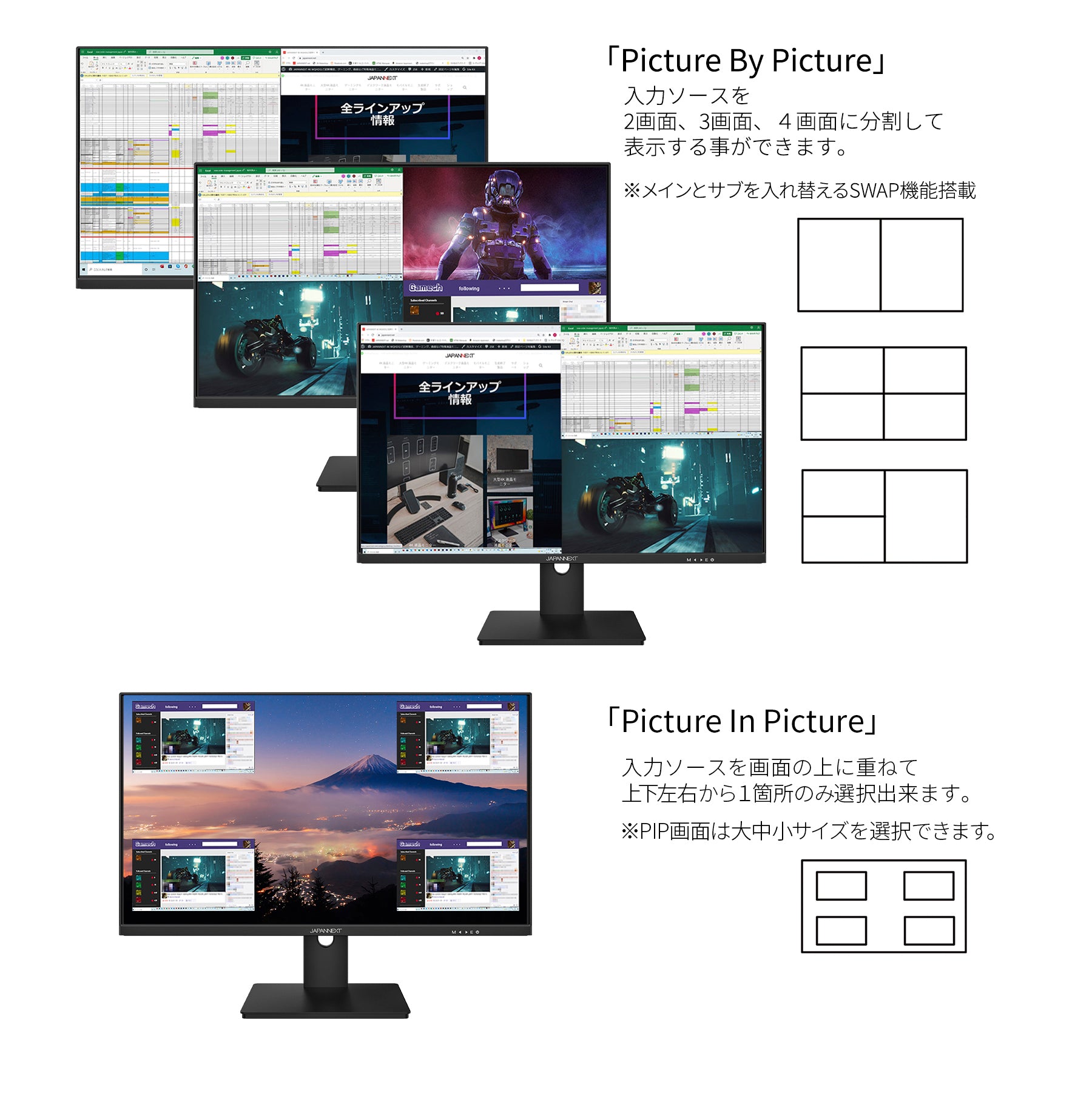 さらにPIP(Picture In Picture)とPBP(Picture By Picture)に対応、PIPではもう一つの入力画面を子画面(左上/右上/左下/右下から選択)で同時表示が可能。PBPでは最大4つの入力を同時に表示することが可能です。