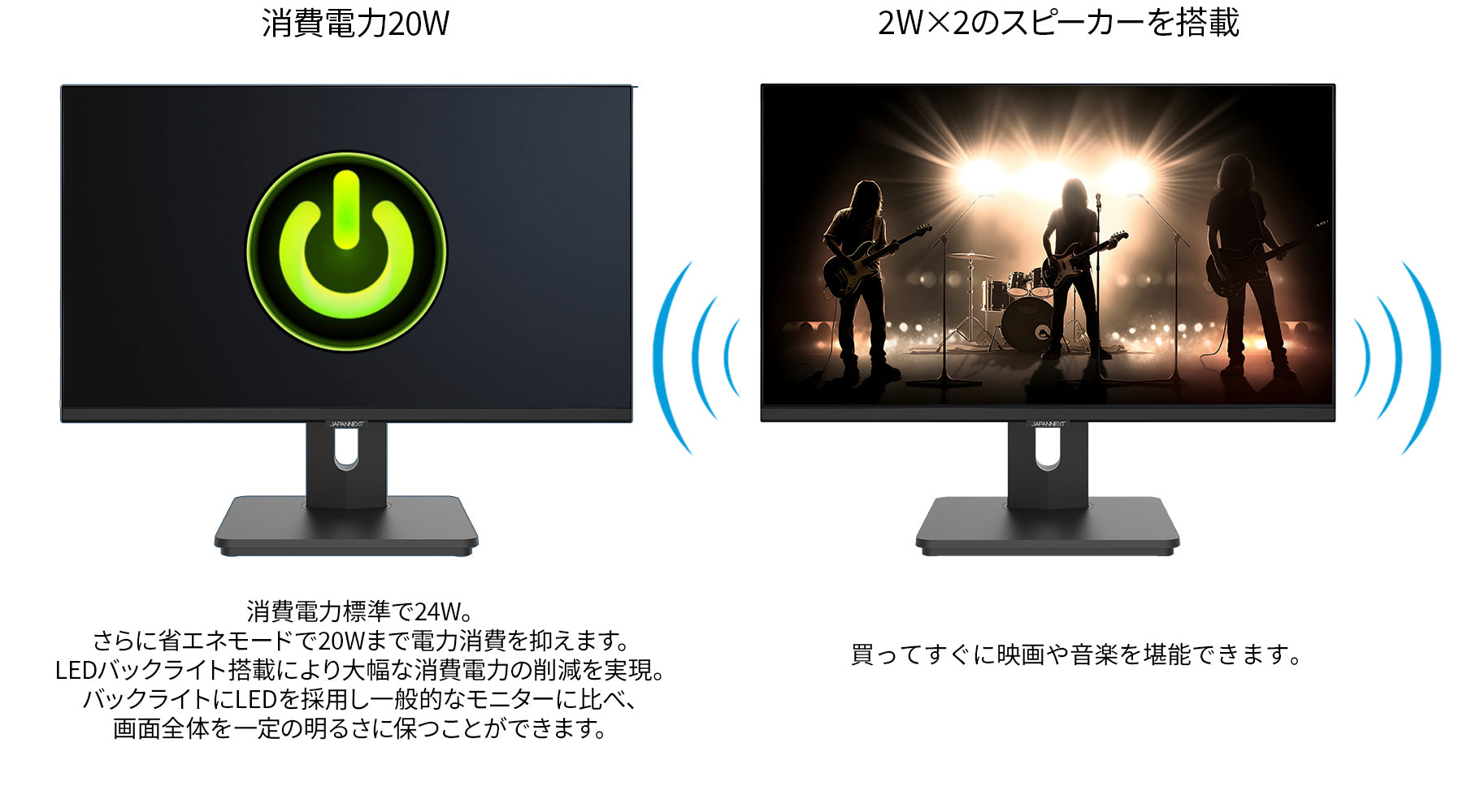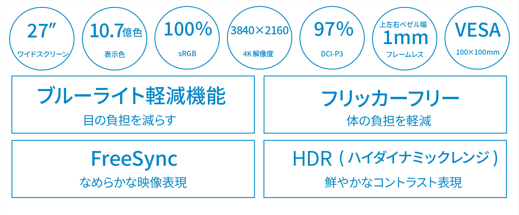 長時間使用時に眼に優しいフリッカーフリー(ちらつき軽減)、ブルーライト軽減モードを搭載します。100x100mmのVESAマウントに対応しますので、別売りのモニターアームなどに使用が可能です。
