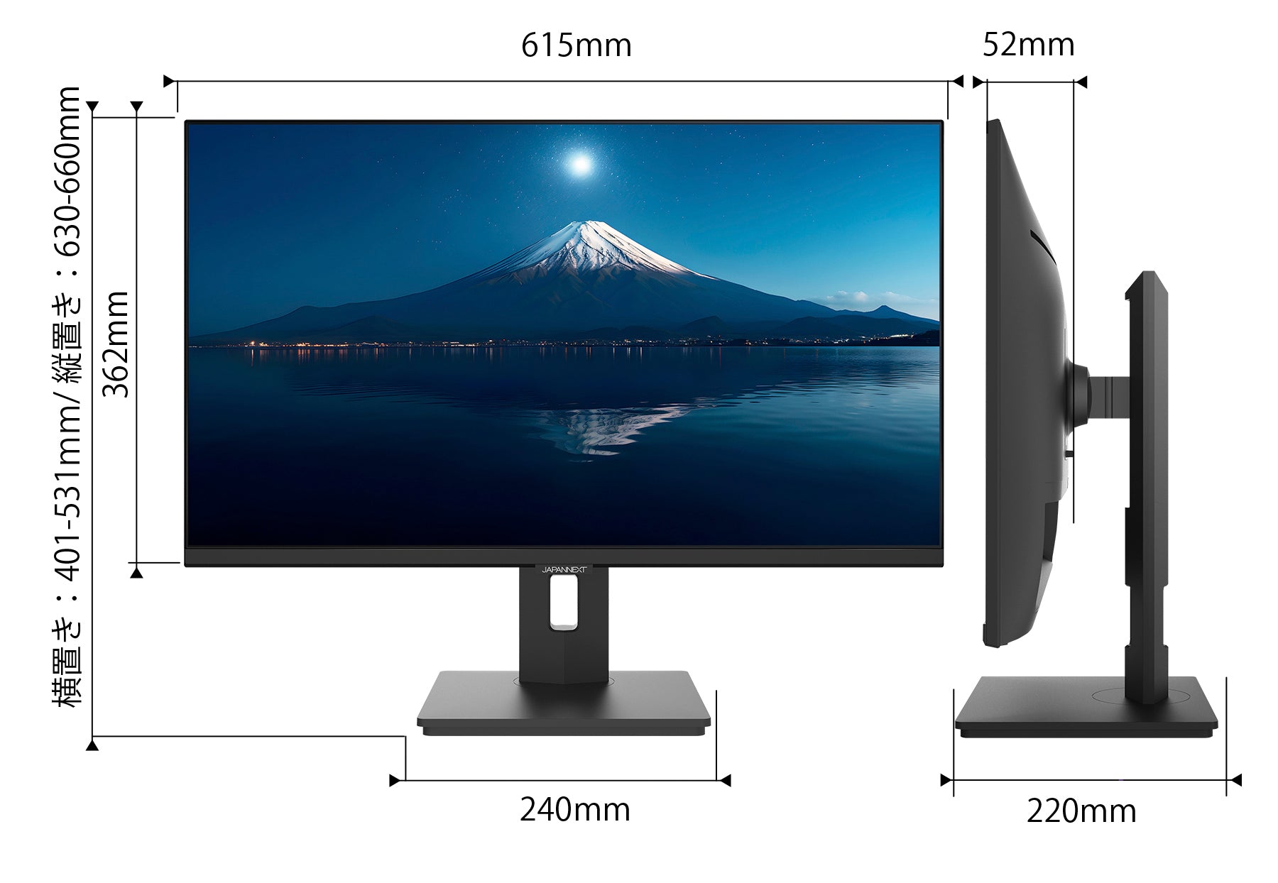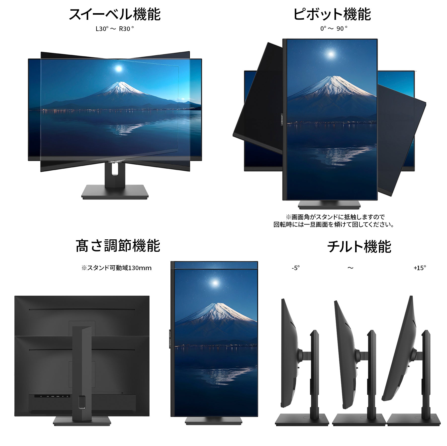 高さ調整が可能な昇降式スタンドを搭載、130mmの範囲内で最適な高さに画面を調整可能です。また縦画面として使用出来るピボット(回転)機能にも対応します。