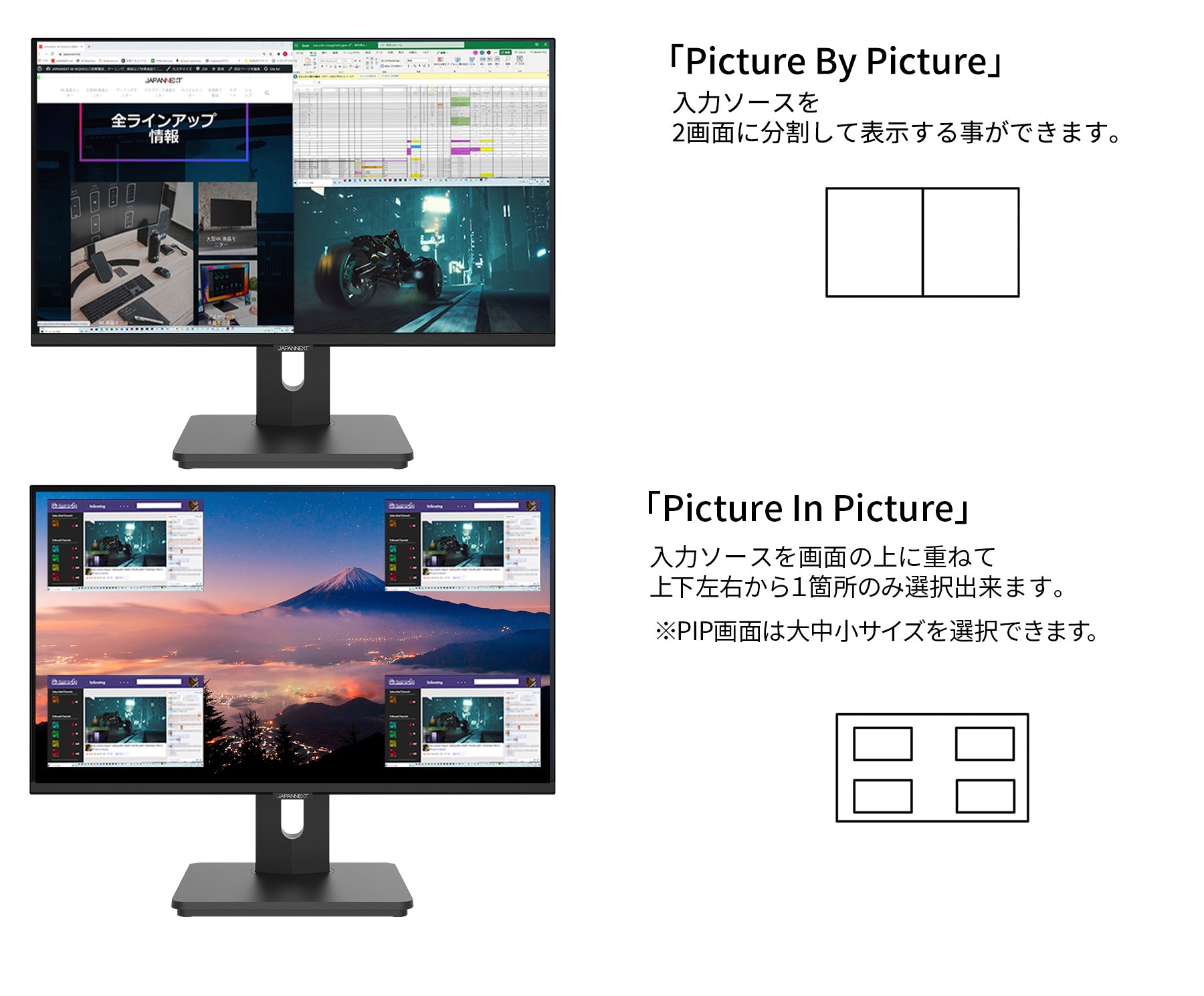 複数の入力を同時に表示するPBP/PIP機能搭載