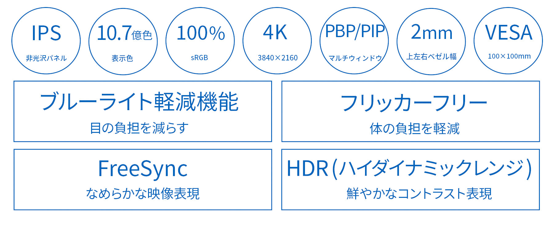 長時間使用時に眼に優しいフリッカーフリー(ちらつき軽減)、ブルーライト軽減モードを搭載します。100x100mmのVESAマウントに対応しますので、