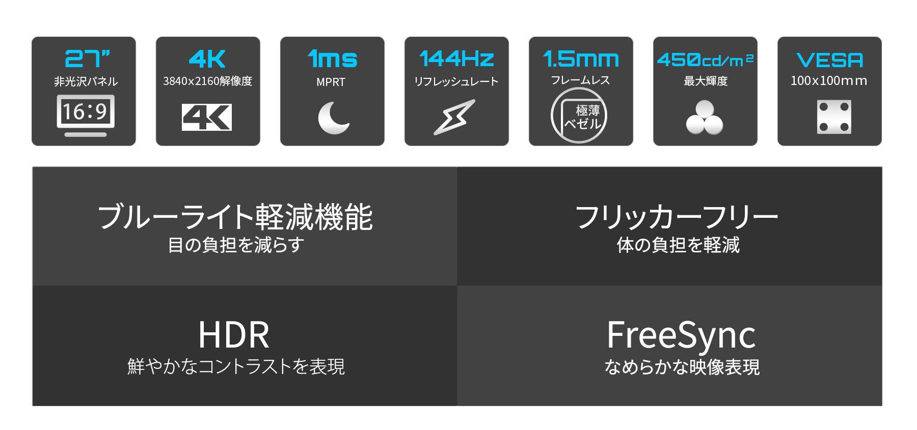 27インチのIPSパネルを搭載、最大144Hzの高速リフレッシュレートに対応した4K解像度(3840x2160)の高解像度を誇るゲーム環境に最適なゲーミングモニターです。