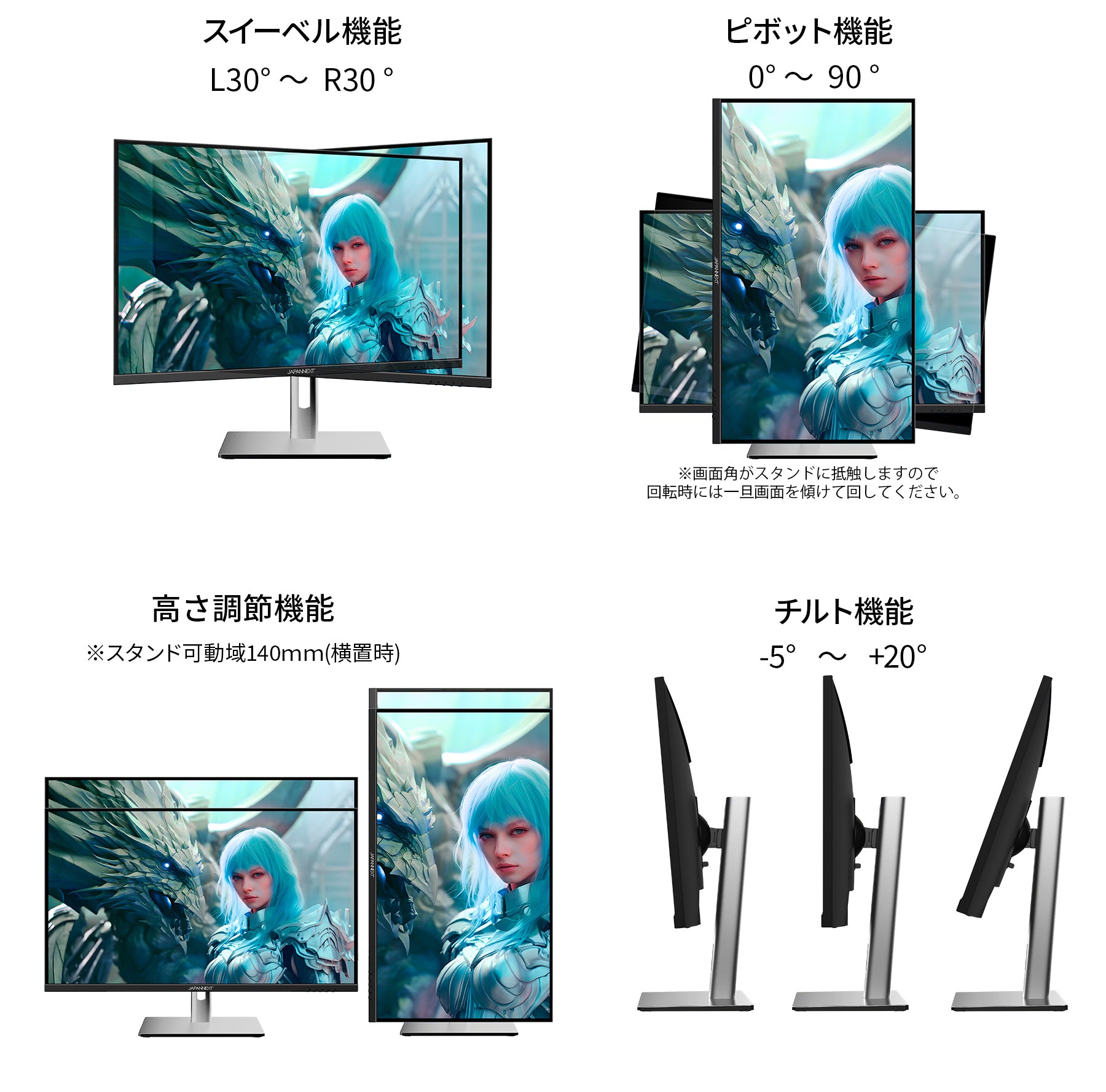 便利な昇降式スタンドを搭載。最大140mm(横置時)の範囲で高さ調整を行うことが可能です。また、90度右に回転させての縦での使用も可能です。