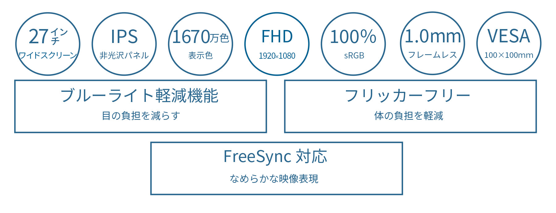 長時間使用時に眼に優しいフリッカーフリー(ちらつき軽減)、ブルーライト軽減モードを搭載します。