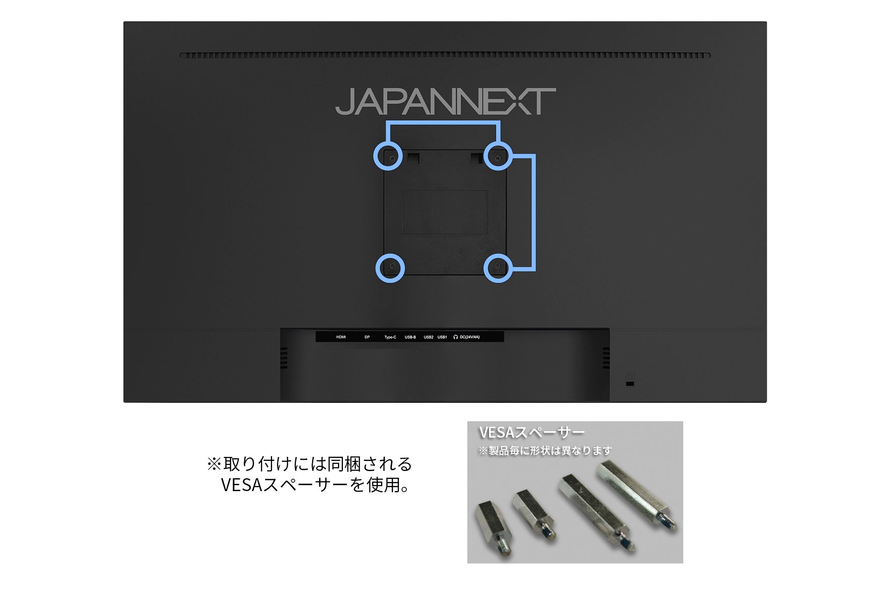 100x100mmのVESAマウントに対応しますので、別売りのモニターアームなどに使用が可能です。