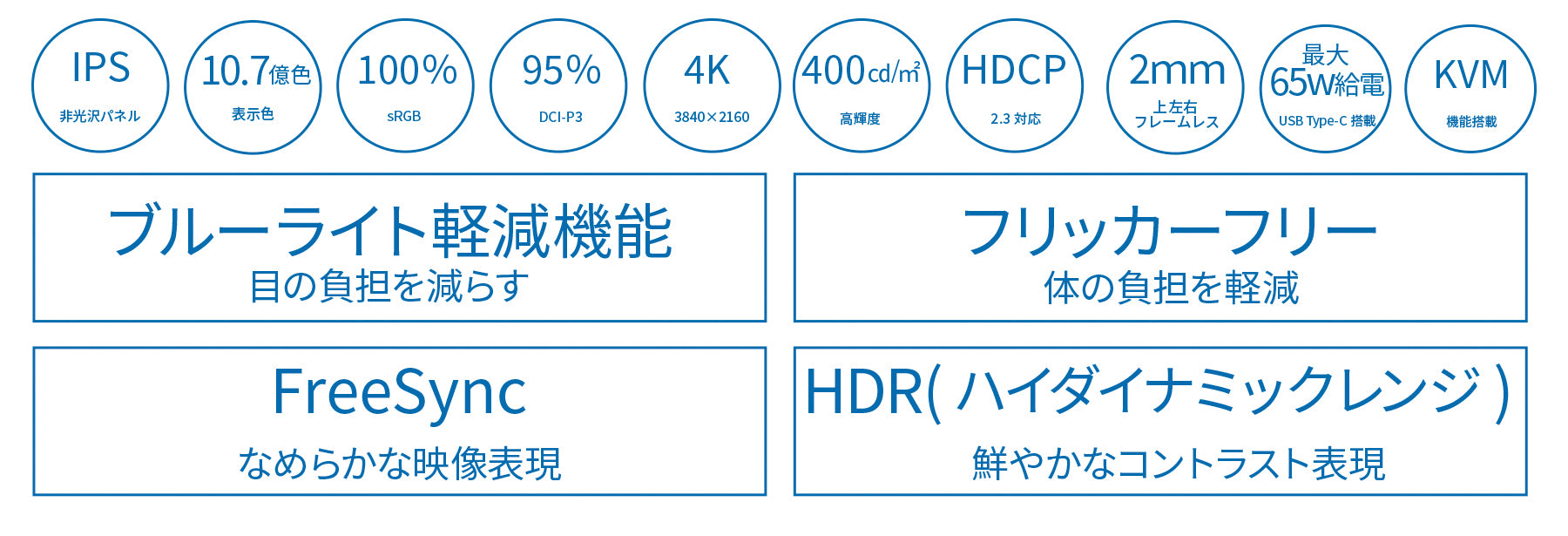 さらにKVM機能に対応。モニターに接続したキーボード、マウスをデスクトップPCやUSB Type-C接続のノートPCで入力を切り替えた際にもそのまま使用可能です。長時間使用時に眼に優しいフリッカーフリー(ちらつき軽減)、ブルーライト軽減モードを搭載します