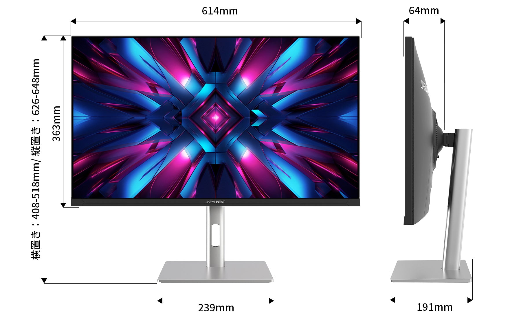 高さ調整が可能な昇降式多機能スタンドを搭載、最大110mmの範囲(横置時)で最適な高さに画面を調整可能です。また縦画面として使用出来るピボット(回転)機能にも対応します。スイーベル(首振り)機能は、左右各15°の範囲で動かせます。