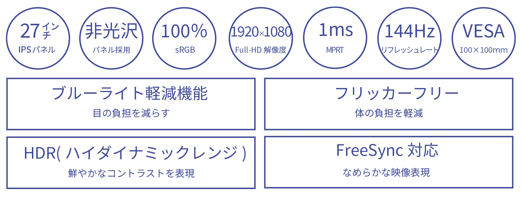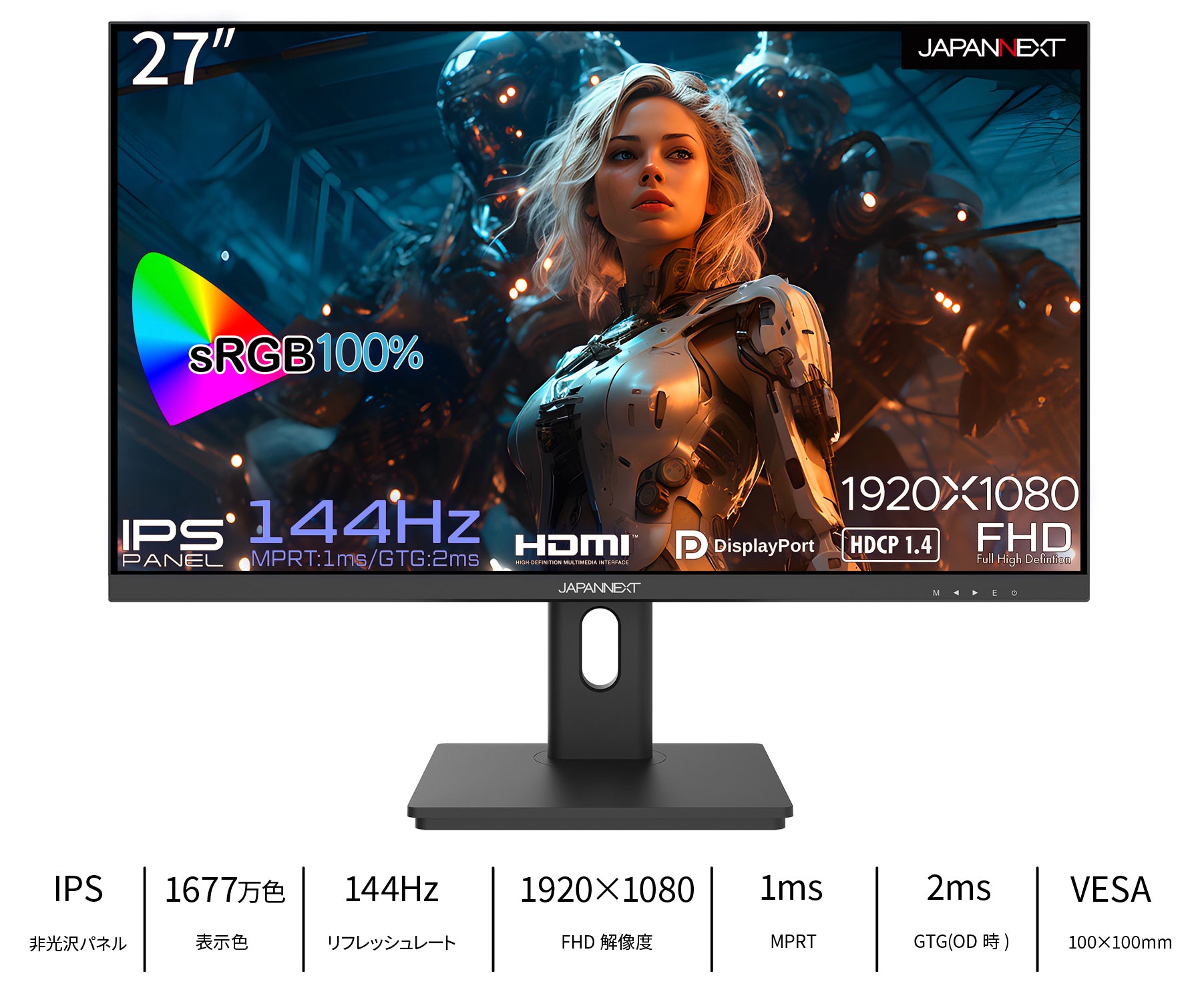 27インチのフルHD(1920 x 1080) 解像度 IPSパネルを採用。1ms(MPRT)*の高速応答速度と144Hzの高速リフレッシュレートに対応。IPSならではの色鮮やかな映像表現を実現した高輝度400cd/m2の高輝度液晶はsRGB100%の広色域に対応、ゲームプレイや動画鑑賞だけでなく、写真や動画の編集作業などにも最適です。