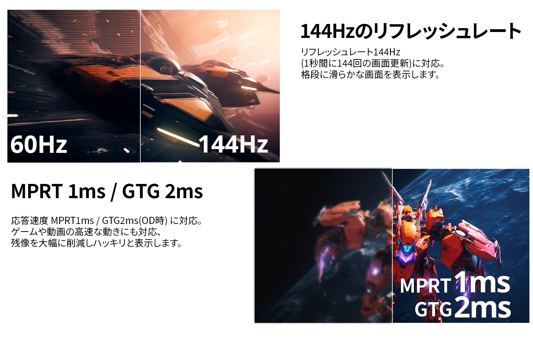 1920×1080解像度 高速リフレッシュレート/144Hz、応答速度/MPRT:1ms GTG:2ms対応