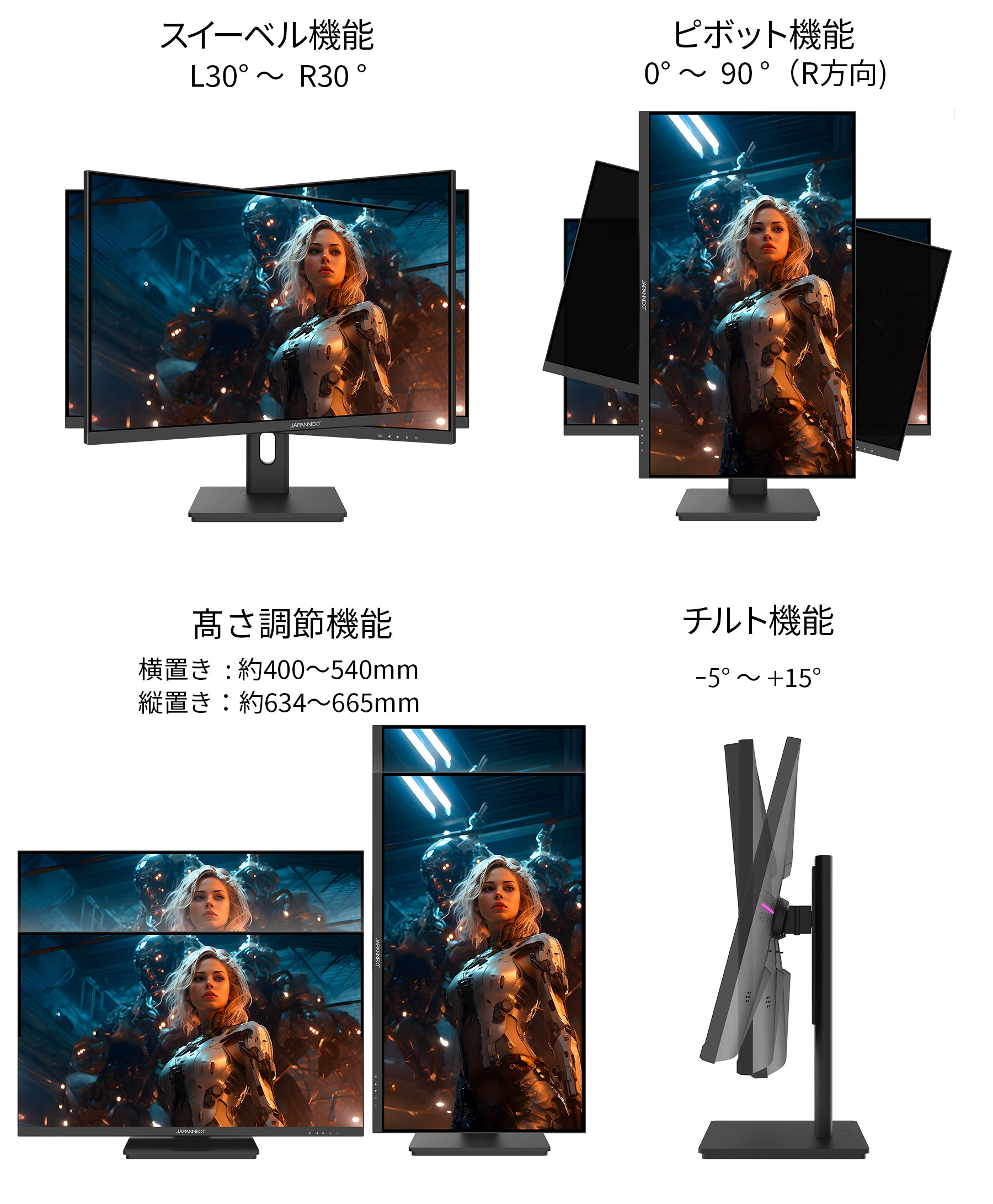高さ調整が可能な、昇降式スタンドを採用。150mmの範囲でお好みの高さにモニターの高さを調整出来ます。さらにピボット機能を搭載で90度回転させて縦での使用も可能です。