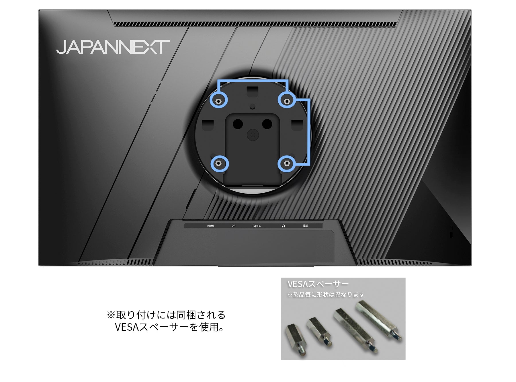 75x75mmのVESAマウントに対応しますので、別売りのモニターアームなどに使用が可能です。