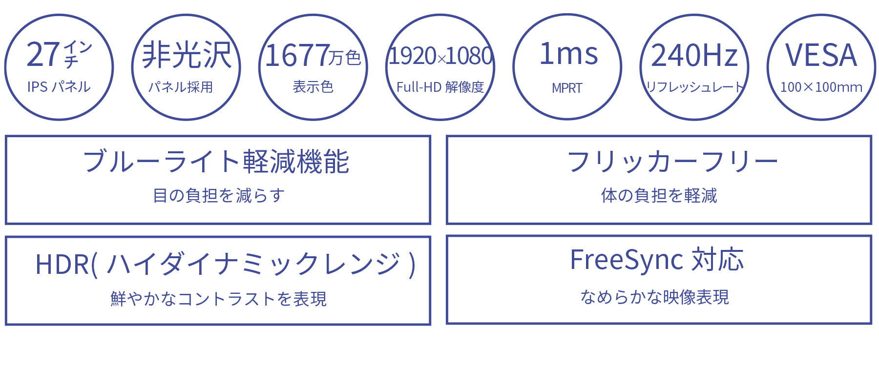 27インチのフルHD(1920x1080)IPSパネルを搭載、240Hzのリフレッシュレート、AMD FreeSyncに対応したゲーミングモニターです。