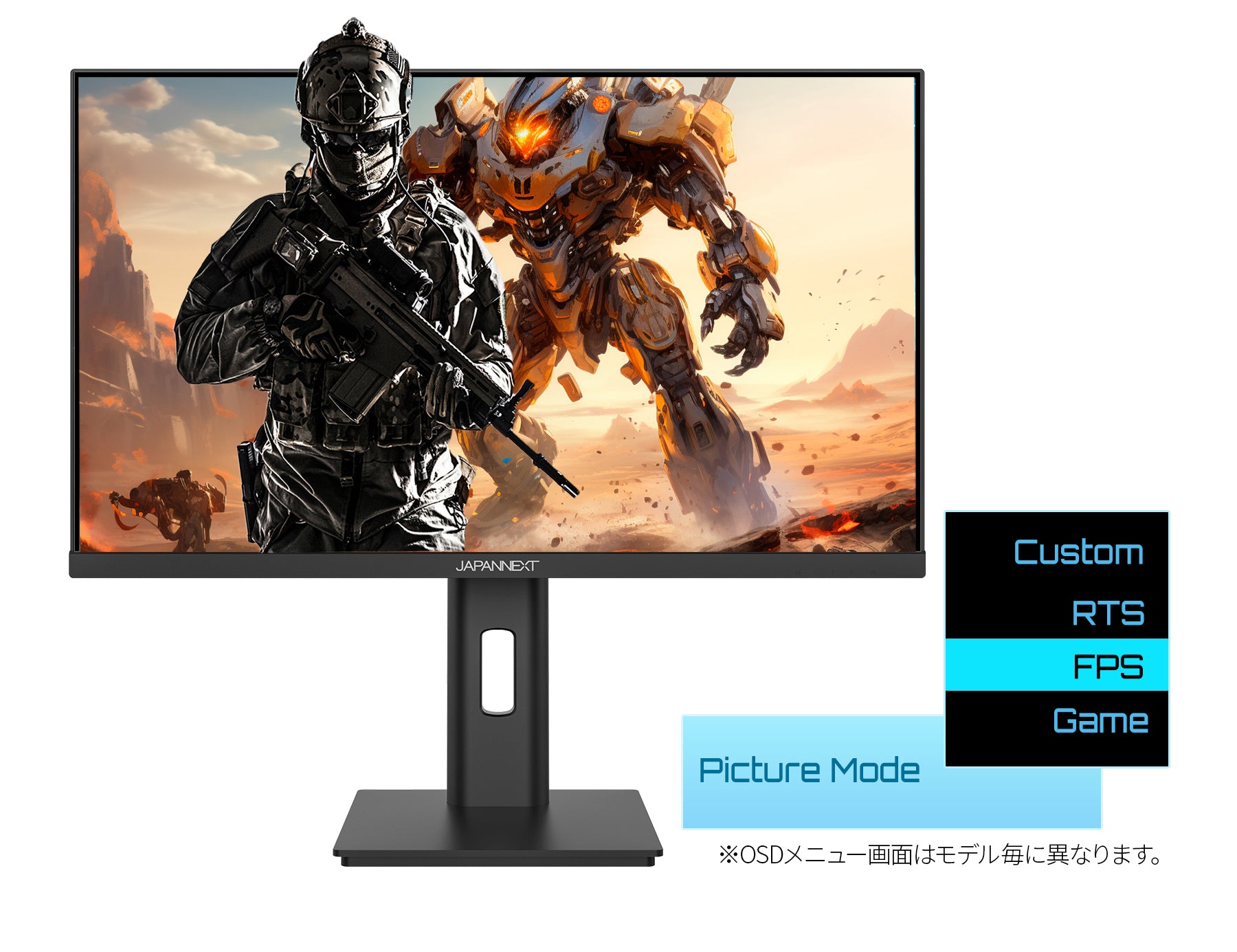 165Hzの高速リフレッシュレート、1ms(GTG:OD時/MPRT)の高速応答速度により、滑らかな映像表示を可能にし、ゲームプレイに最適です。3つのゲームモードを搭載しFPSなどゲームに合わせて変更可能です。*MPRT1msはリフレッシュレート100Hz以上で有効。
