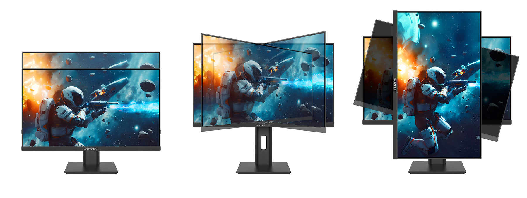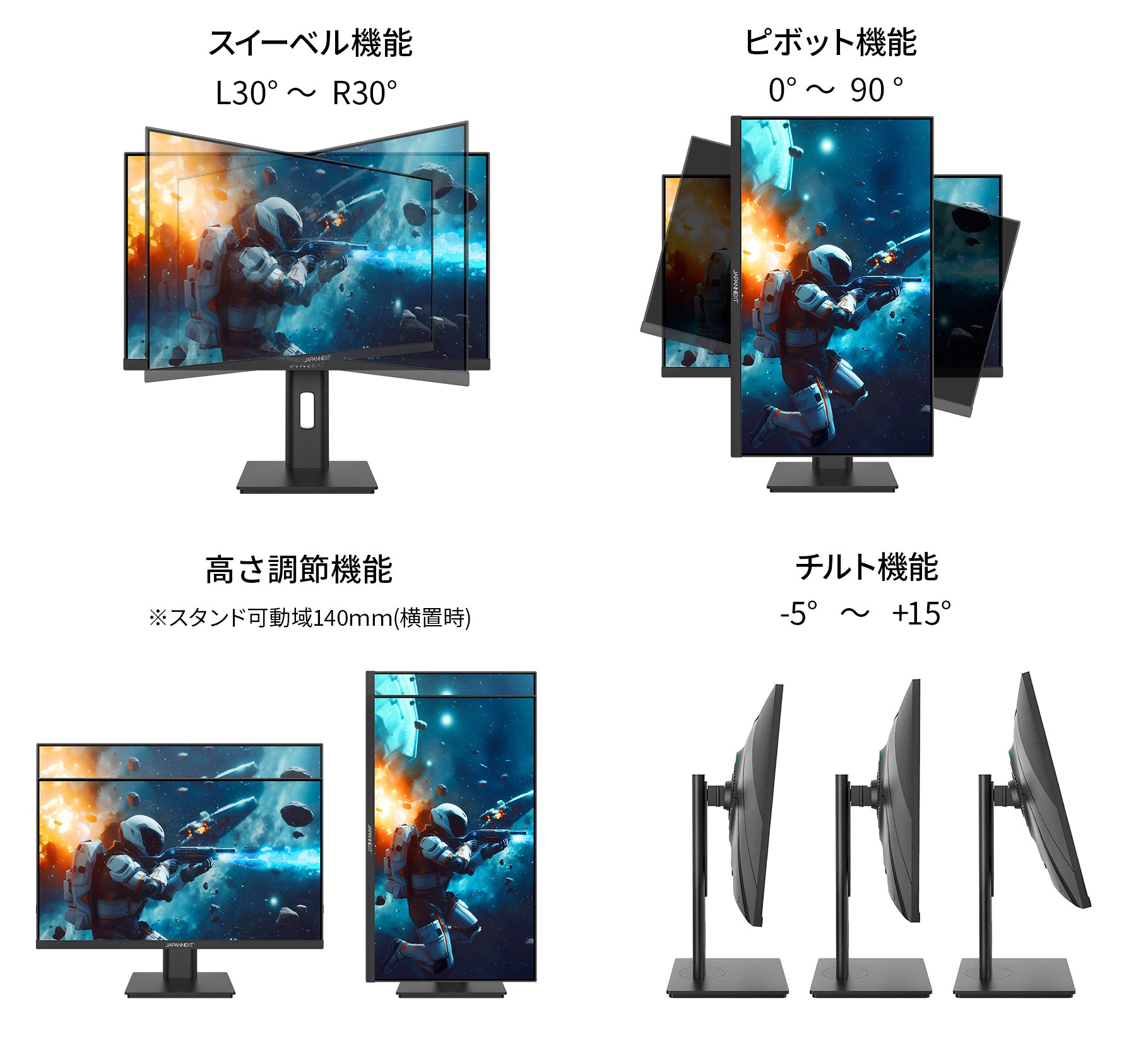 高さ調整が可能な昇降式多機能スタンドを搭載、最大140mmの範囲(横置時)で最適な高さに画面を調整可能です。また縦画面として使用出来るピボット(回転)機能にも対応します。スイーベル(首振り)機能は、左右各30°の範囲で動かせます。