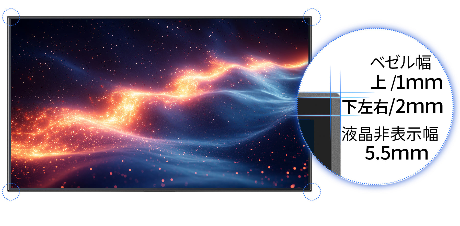 4辺フレームレスデザインを採用。浮かび上がるようにコンテンツを鮮やかに映し出します。4辺狭額縁パネルによる省スペース設計を行い、置く場所にも困らない使いやすいサイズを実現しました。また複数並べて使用するマルチディスプレイ構成にも最適です。