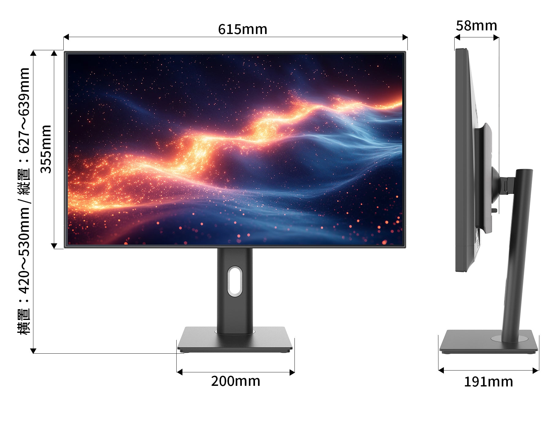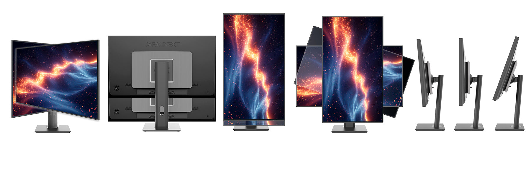高さ調整が可能な昇降式多機能スタンドを搭載、110mmの範囲(横置時)で最適な高さに画面を調整可能です。また縦画面として使用出来るピボット(回転)機能にも対応します。スイーベル機能は(L30°R30°)の範囲で動かすことが可能です。