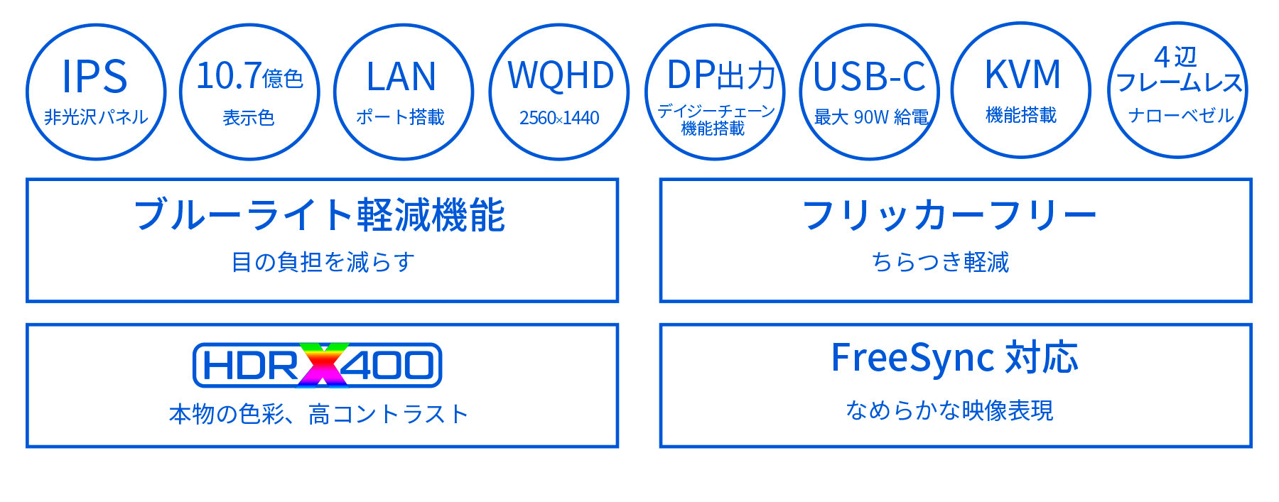 長時間使用時に眼に優しいフリッカーフリー(ちらつき軽減)、ブルーライト軽減モードを搭載します。