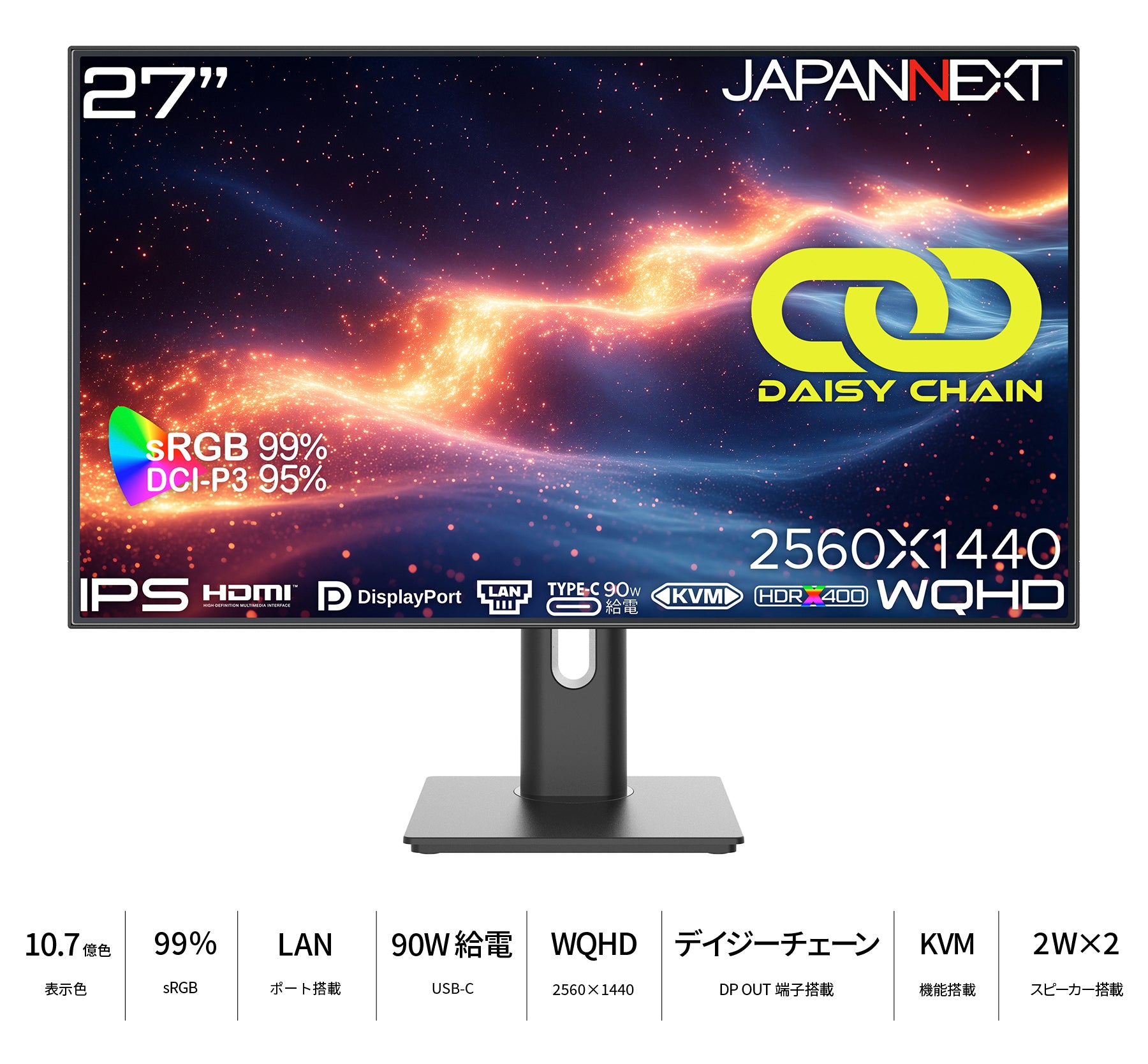 27インチのIPSパネルを搭載し、WQHD(2560x1440)解像度に対応した液晶モニターです。フルHD(1920x1080)より+78%も高精細なWQHD(2560x1440)は、デスクワークで高い生産性を実現します。