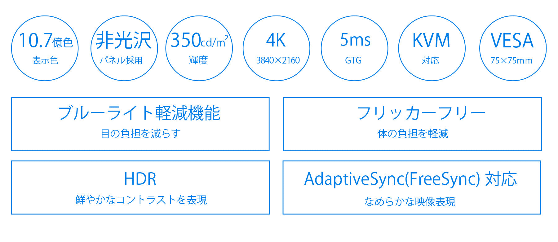 27インチのIPSパネルを搭載し、4K(3840x2160)解像度に対応した液晶モニターです。フルHD(1920x1080)の4倍の高解像度は複数のウィンドウの同時表示を可能にし、圧倒的な高生産性を実現します。