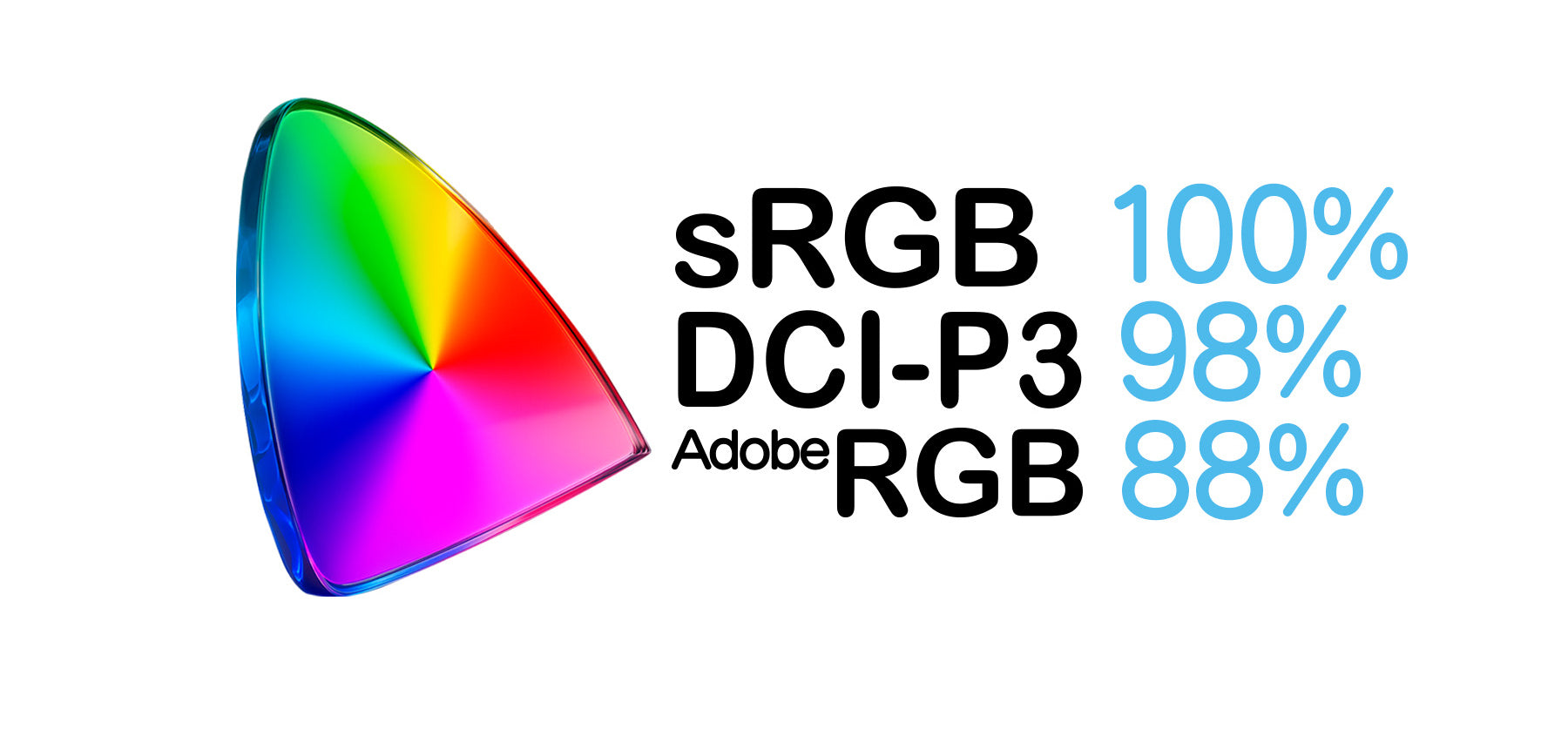 sRGB:100%、DCI-P3:98%、AdobeRGB:88%をカバーし、鮮やかで精緻な色彩表現を実現します。