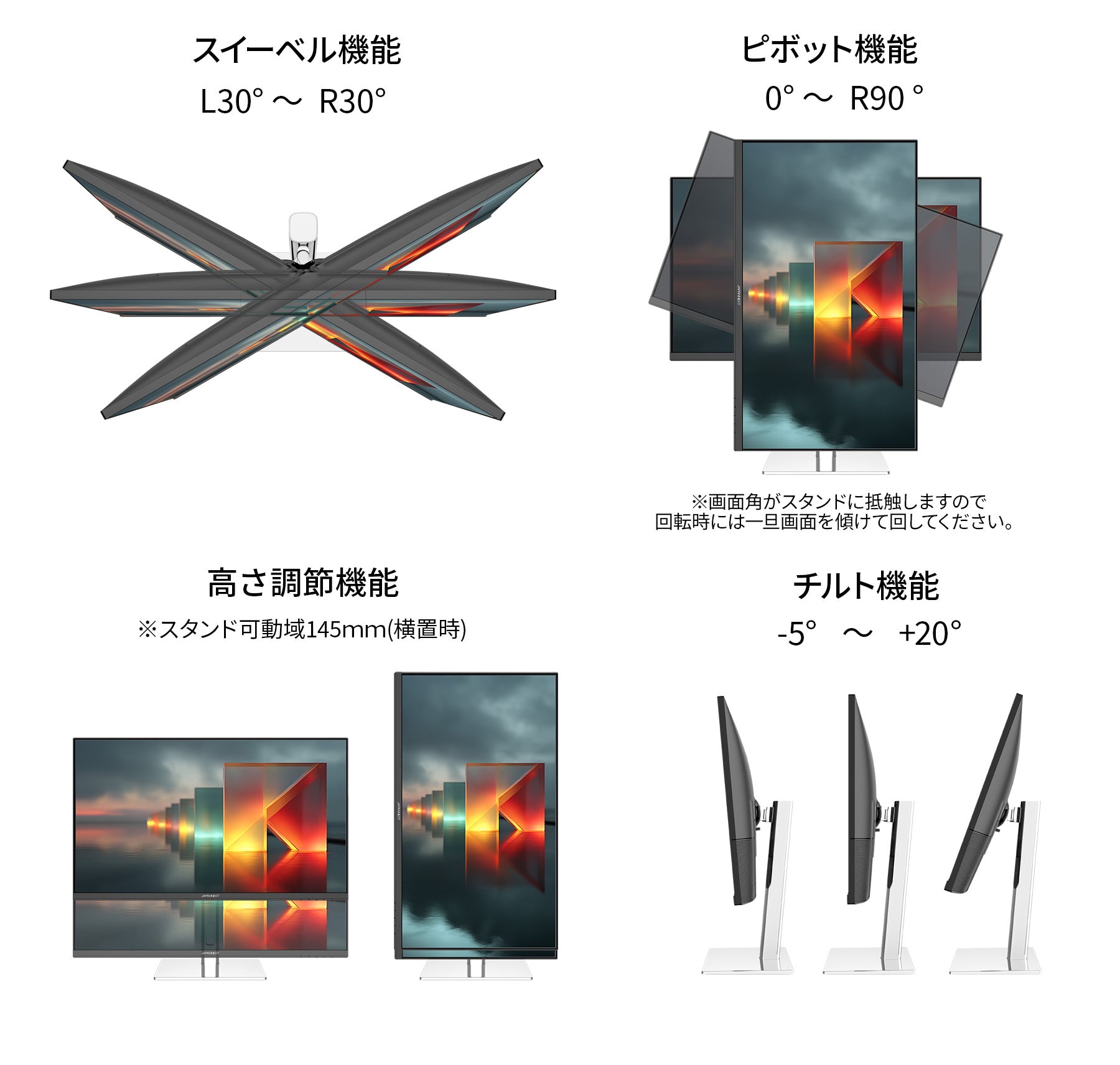 高さ調整が可能な昇降式多機能スタンドを搭載、最大145mmの範囲(横置時)で最適な高さに画面を調整可能です。また、縦画面として使用出来るピボット(回転)機能にも対応します。スイーベル(首振り)機能は、左右各30°の範囲で動かせます。