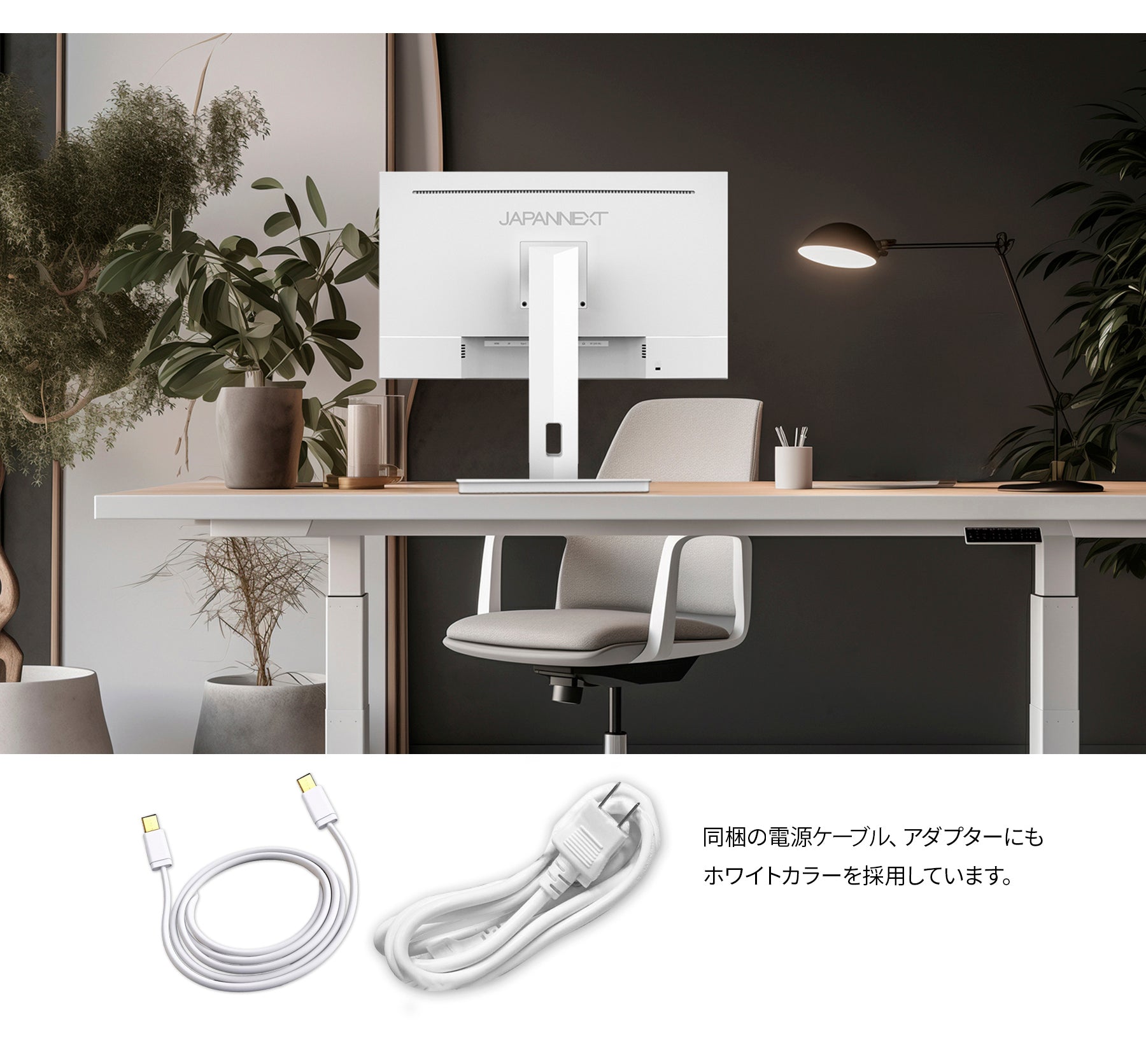 本体カラーにホワイトを採用。モニターベゼルやスタンドも白となっており、爽やかでおしゃれな空間を演出したい場合や、医療機関などでの使用にも最適なデザインです。さらに、付属の電源アダプターとケーブル類全てにホワイトカラーを採用。全体が白基調に統一された部屋や医療機関などでの使用にも最適です。