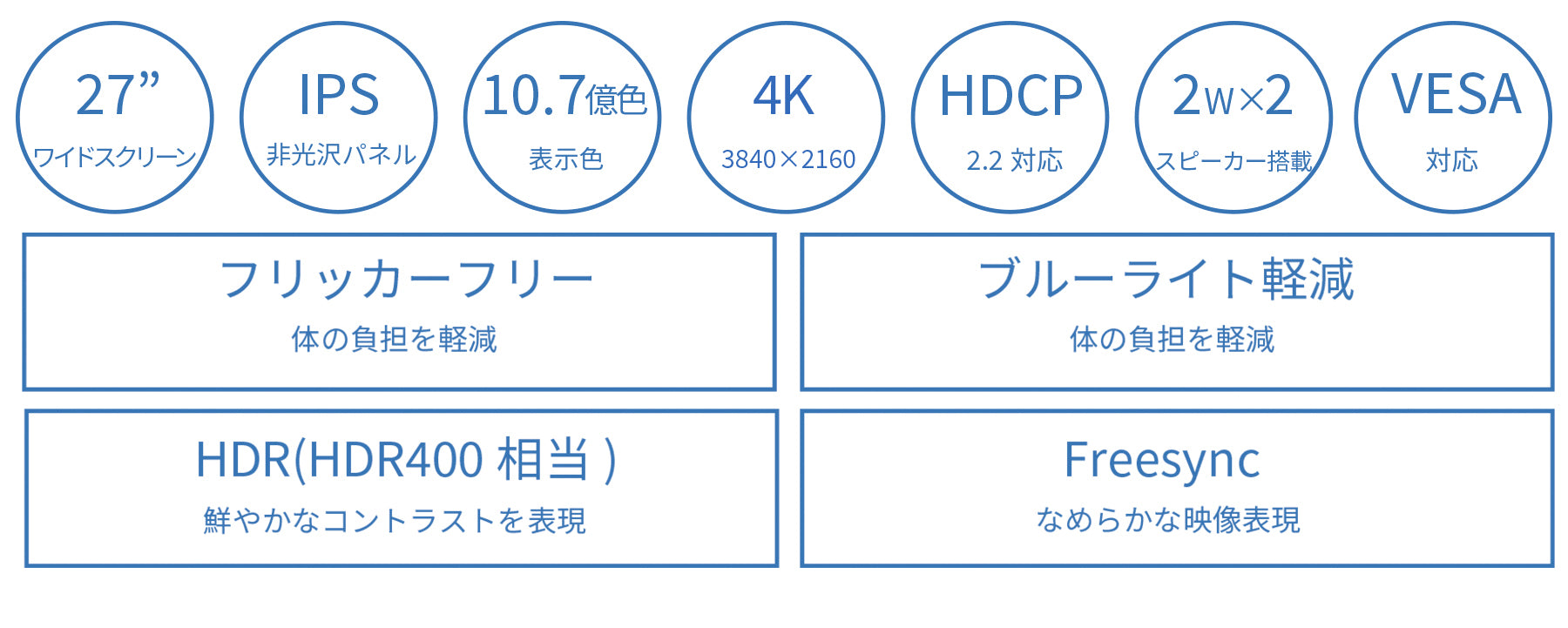 長時間使用時に眼に優しいフリッカーフリー(ちらつき軽減)、ブルーライト軽減モードを搭載します。100x100mmのVESAマウントに対応しますので、別売りのモニターアームなどに使用が可能です。