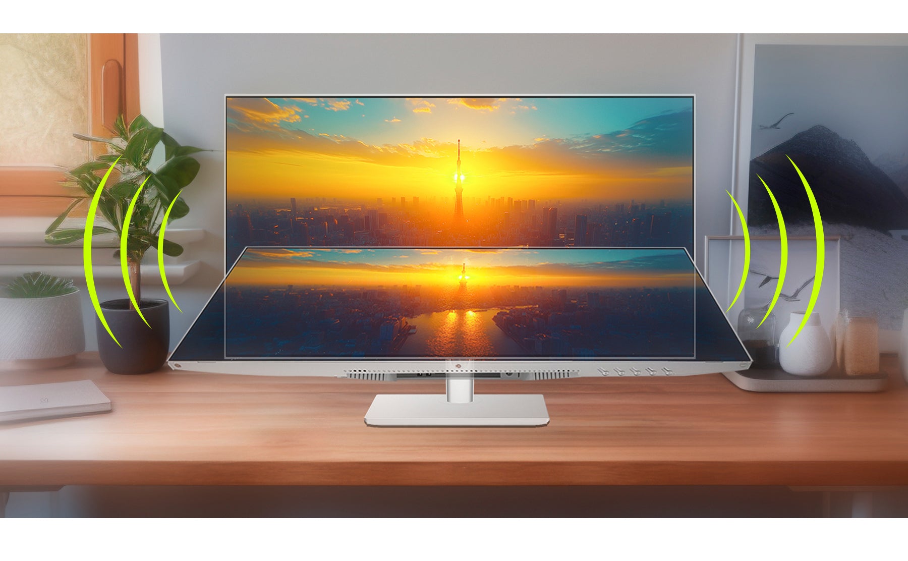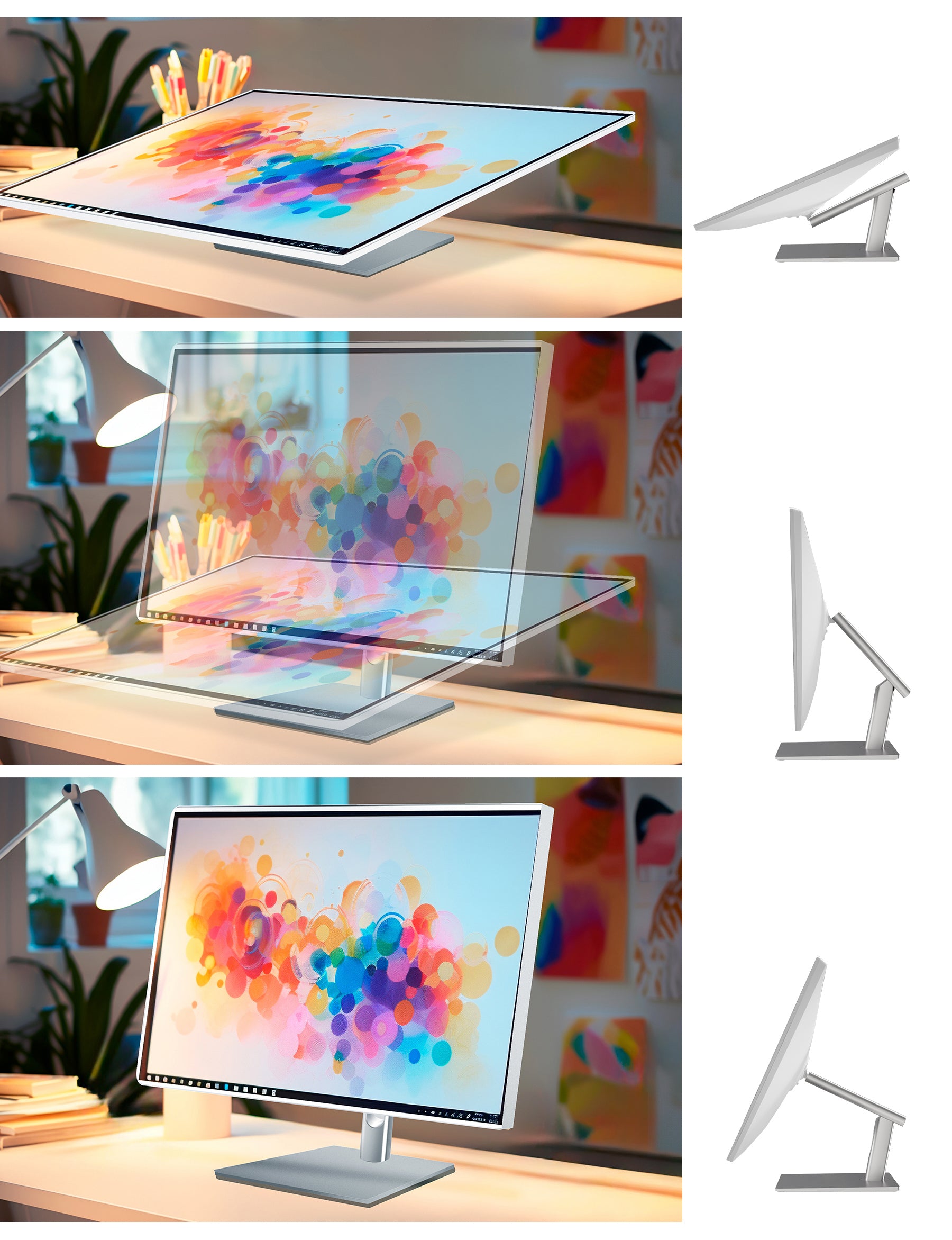 画面を寝かせてタッチ操作も可能な多機能フラットスタンド搭載。スムーズな可動域で、使いやすさと機能美を両立し、最適なポジションに簡単に調整できます。最大220mm(横置時)の範囲内で高さ調整ができるだけでなく、水平方向のスイーベル(左右各15度)、角度調整チルト(横置時:-5度~+70度、縦置時:+5度~+70度)も可能です。最大70度までの角度調整と合わせて高さも調整できるので、画面を寝かせた状態でタッチ操作を行うことが可能です。また縦画面として使用出来るピボット(回転)機能にも対応します。
