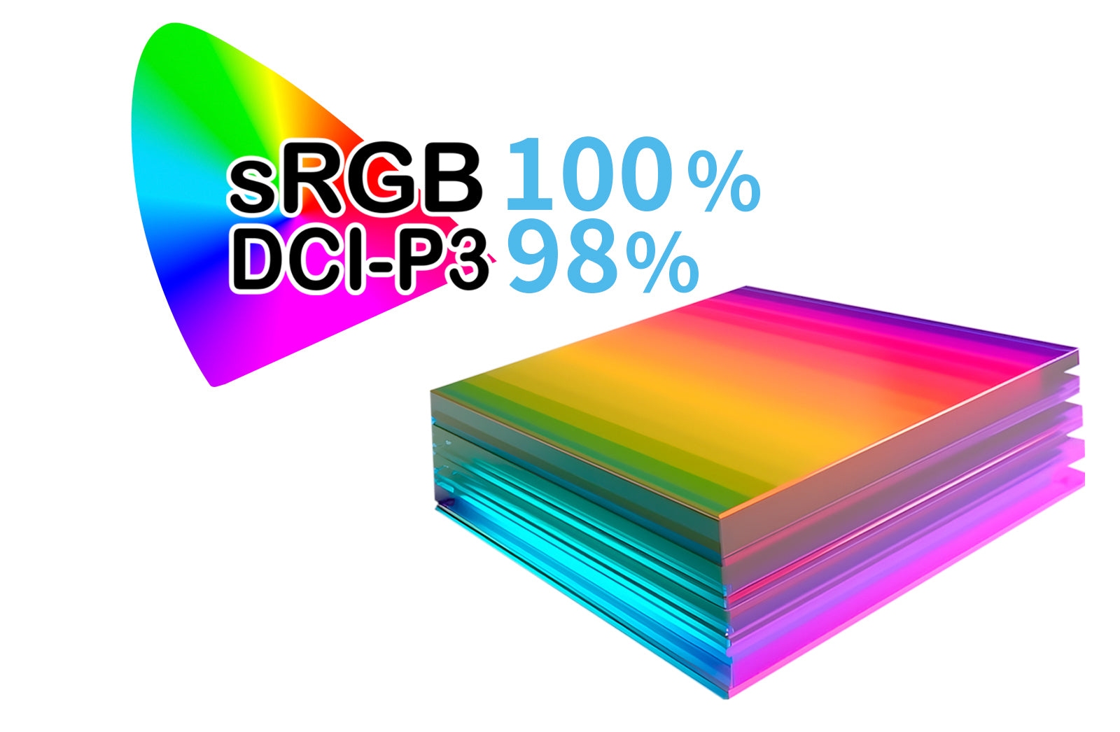 sRGB:100%, DCI-P3:98%の高性能パネルが画像を鮮やかな色彩でくっきりと表示します。