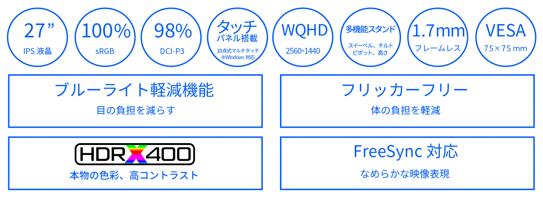 sRGB:100% / DCI-P3:98% / 多機能フラットスタンド搭載